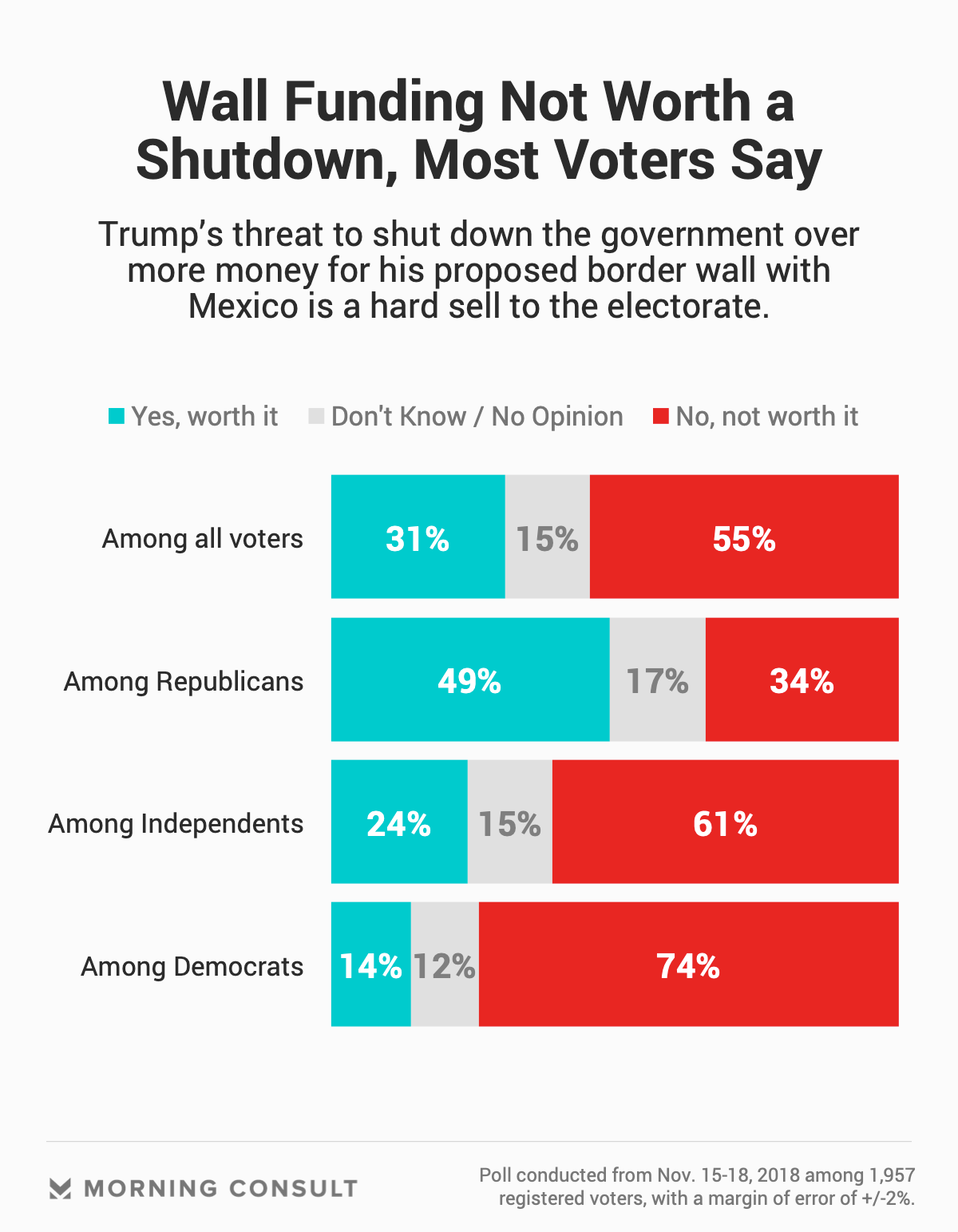 Once again, a potential shutdown over about a $5 billion increase in wall funding does not appear to play well with most voters, a Morning Consult/Politico survey shows.