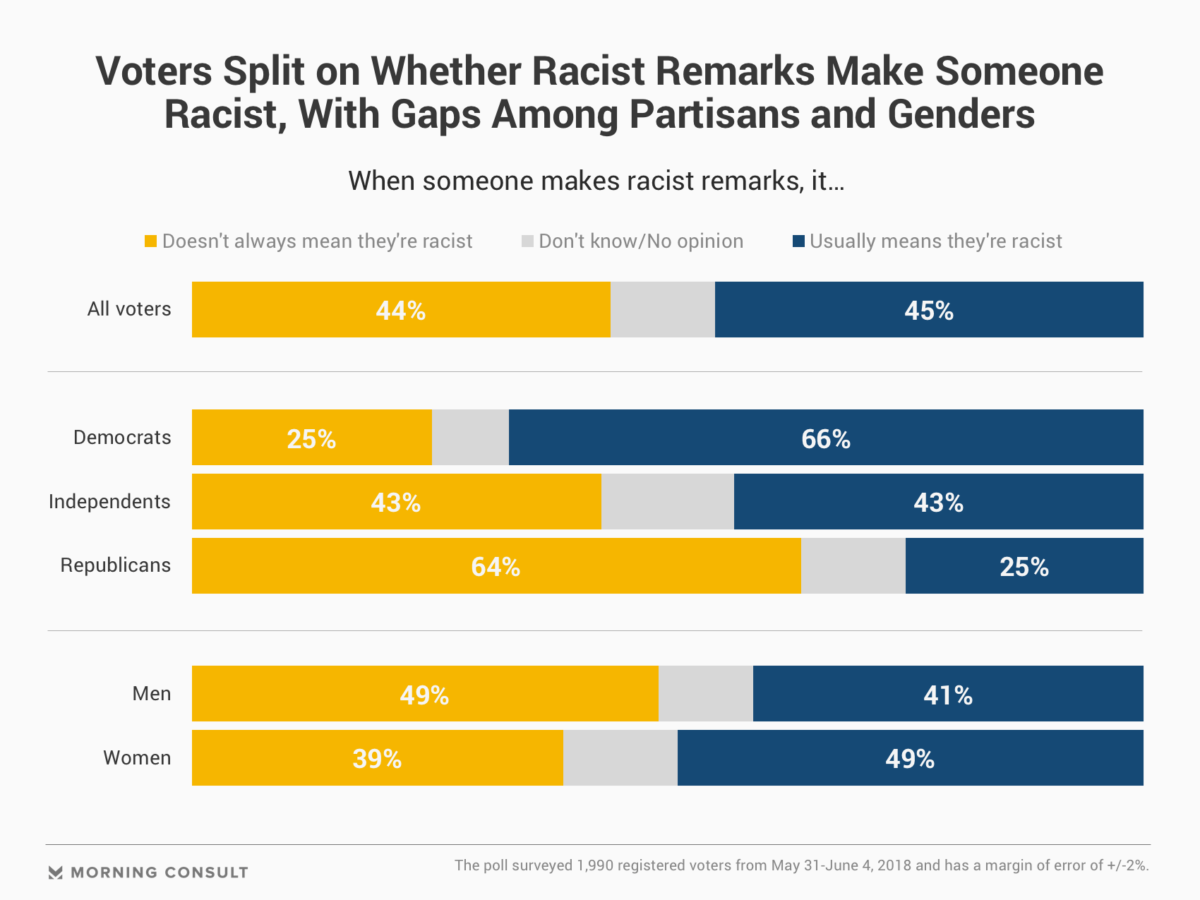 64% of Republicans said racist remarks don’t always mean someone is racist -- 66% of Democrats said it usually means they are.
