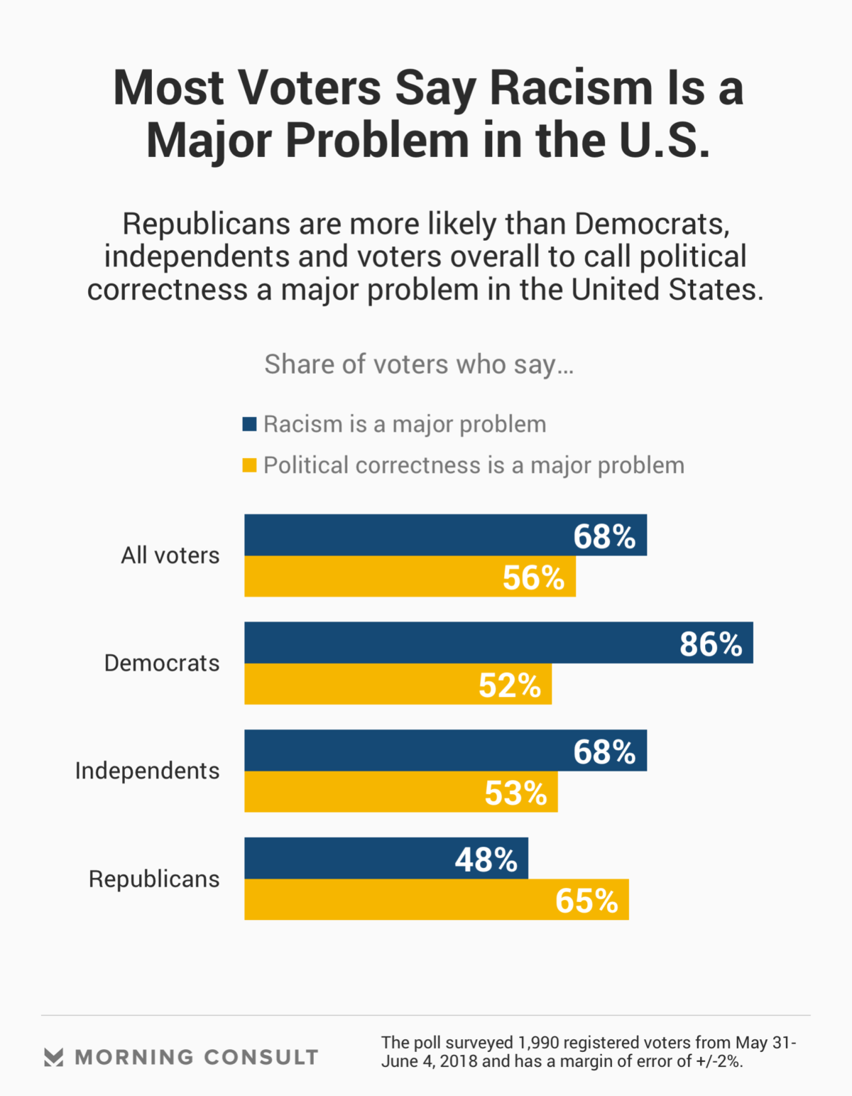 A larger share of Democrats than Republicans – 86 percent to 48 percent – said racism is a major problem in the United States, according to the poll. GOP voters, on the other hand, were more likely -- 65 percent to 52 percent -- to say political correctness is a major problem.