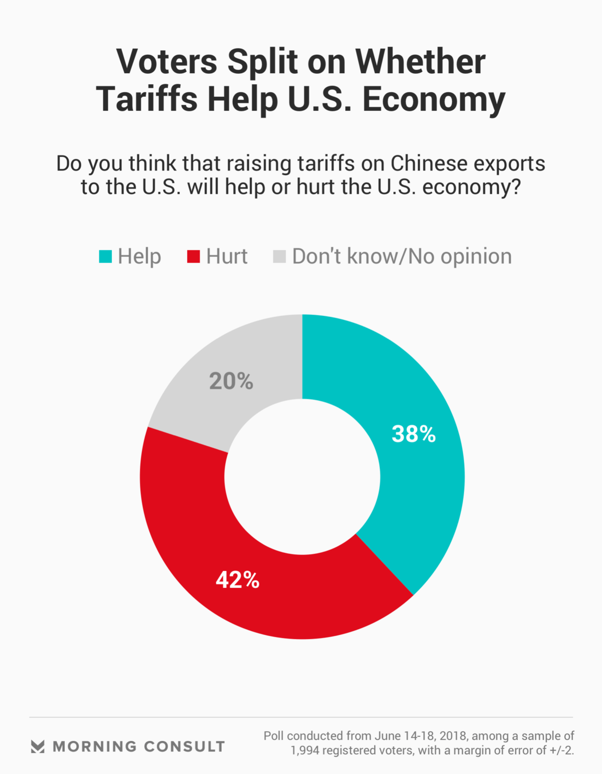 Voters are still split on whether the tariffs will hurt or help the U.S. economy, governed in part by their broader political leanings. The poll was conducted June 14-18, before Trump announced the latest escalation of a burgeoning trade war.