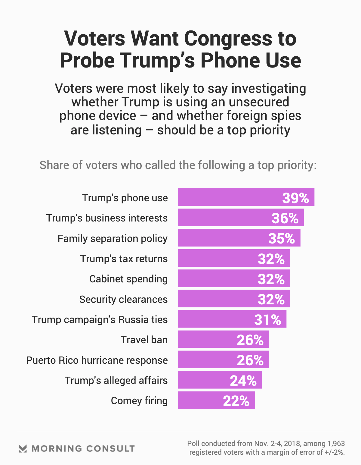 A new Morning Consult/Politico survey shows that in terms of oversight, voters say a top priority for Congress should be investigating President Donald Trump’s reported use of unsecured cellphones and whether spies from China and Russia are routinely listening to the president’s calls.