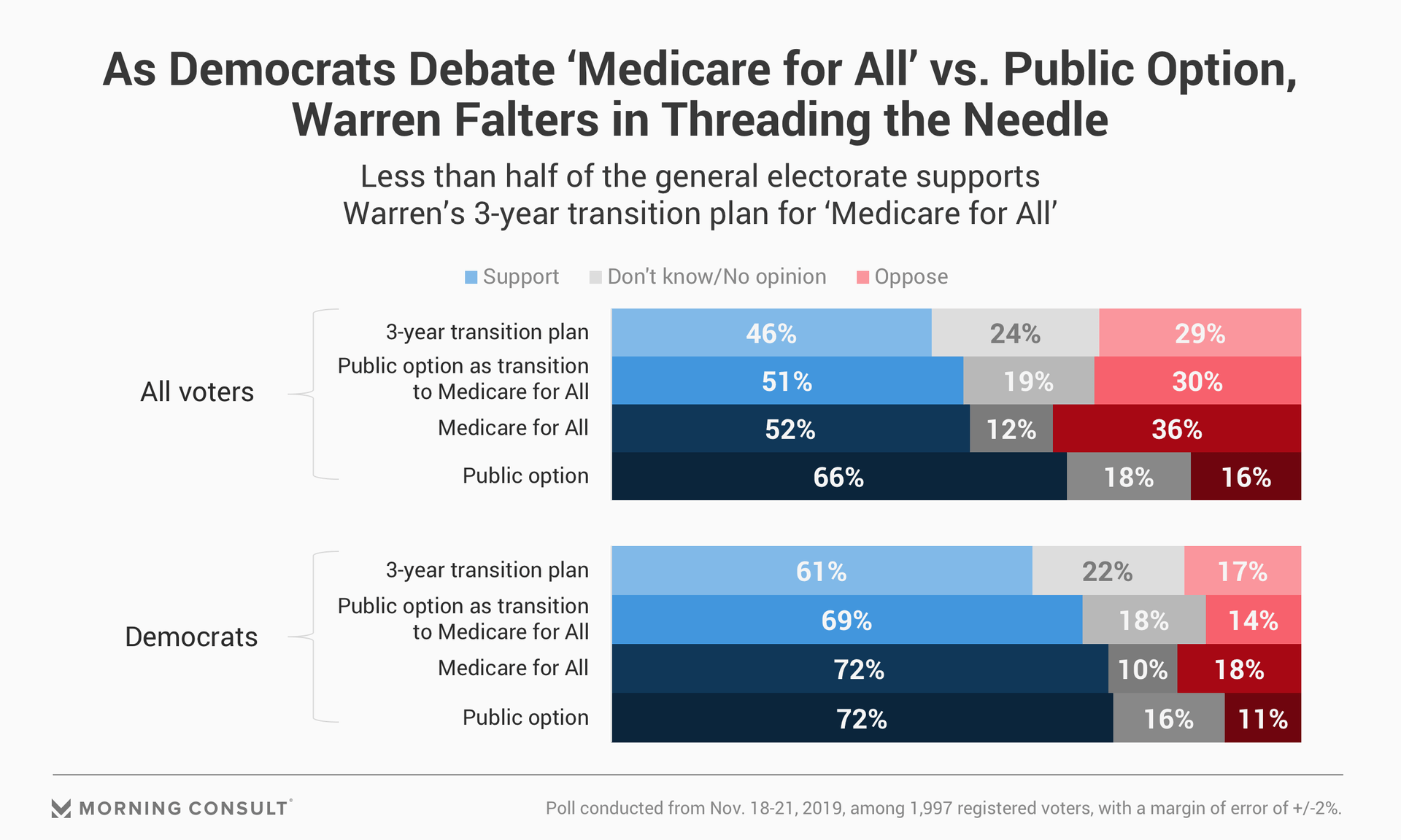 In the days following the unveiling of her plan, Warren’s surge stalled and reversed, particularly among Democrats whose top priority heading to the polls is health care. And according to a new Morning Consult survey of 1,997 registered voters, the Massachusetts senator’s proposal to create a public option as a transition to Medicare for All is less popular among both Democrats and the full electorate than Medicare for All itself, suggesting she may be taking a risk in the primary without the promise of a more incremental approach giving her an edge come the general election.