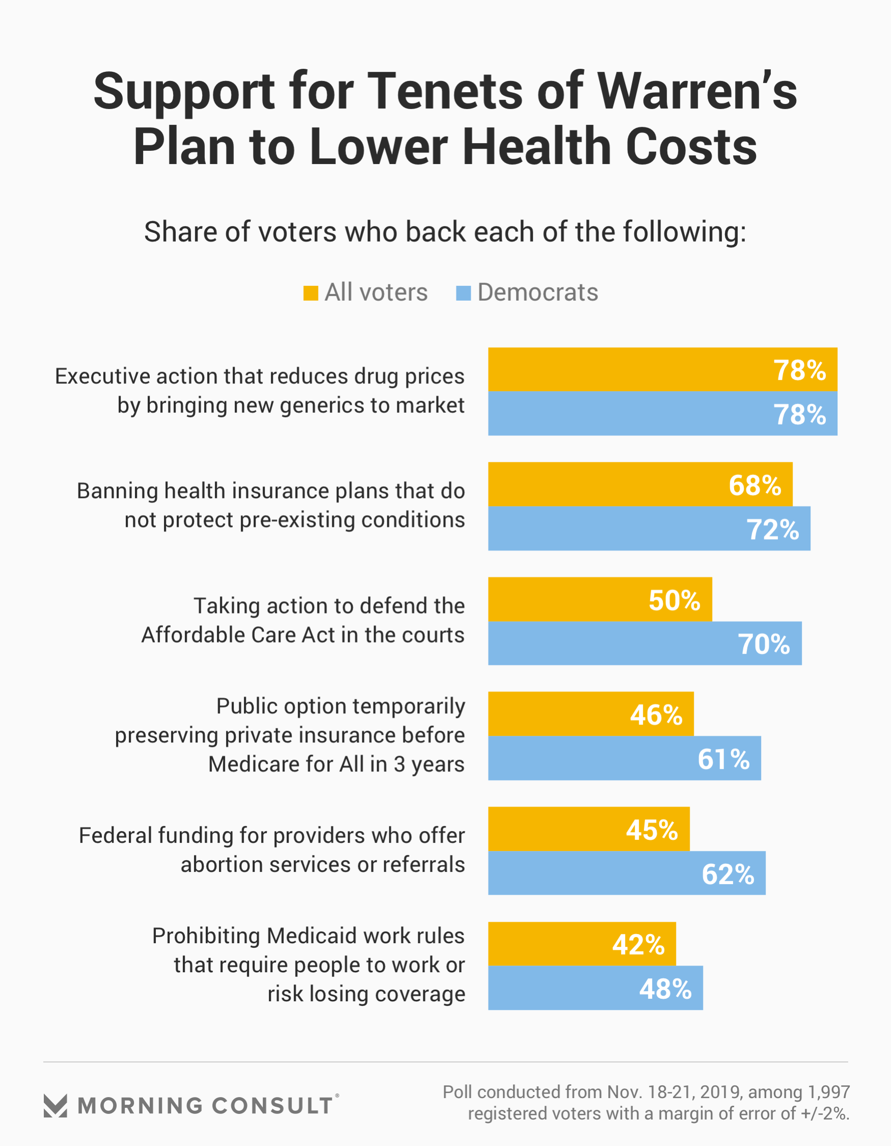 Most popular element of Warren’s plan is executive action reducing drug prices by bringing new generics to market, with 78% voter support.