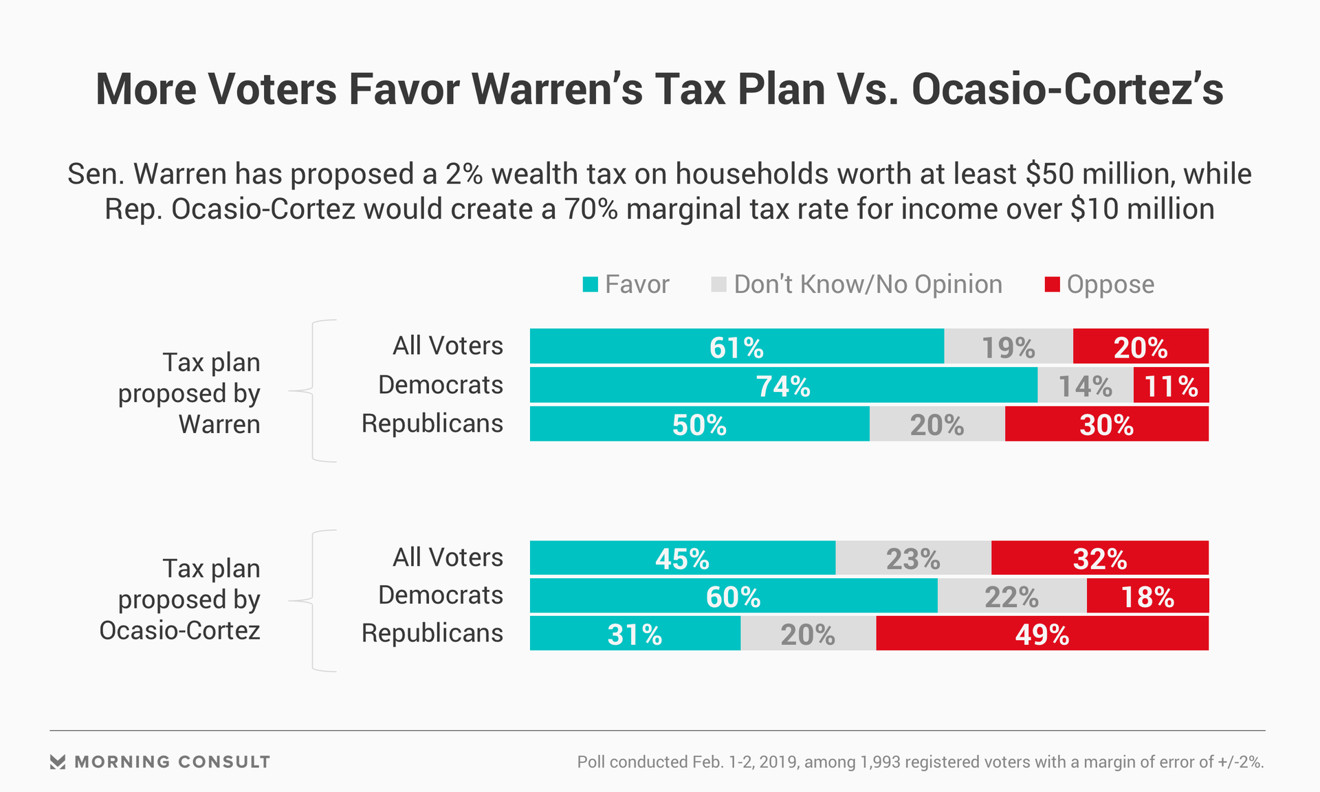 Warren’s tax plan also fared better with Democrats: 74 percent favored it compared to 60 percent for Ocasio-Cortez’s proposal.