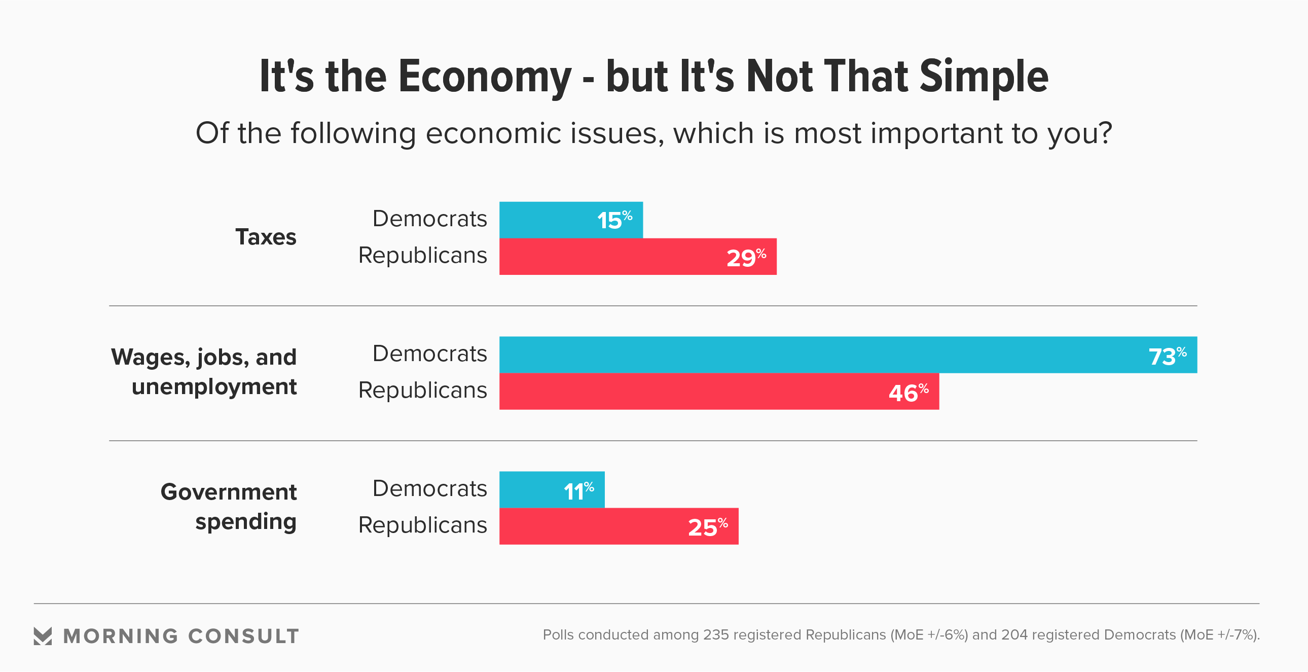 While the president remains the central issue of the election cycle, both Democrats (20 percent) and Republicans (22 percent) placed a similar emphasis on economic issues. But what those “kitchen table” issues mean, exactly, has diverged between partisans.
