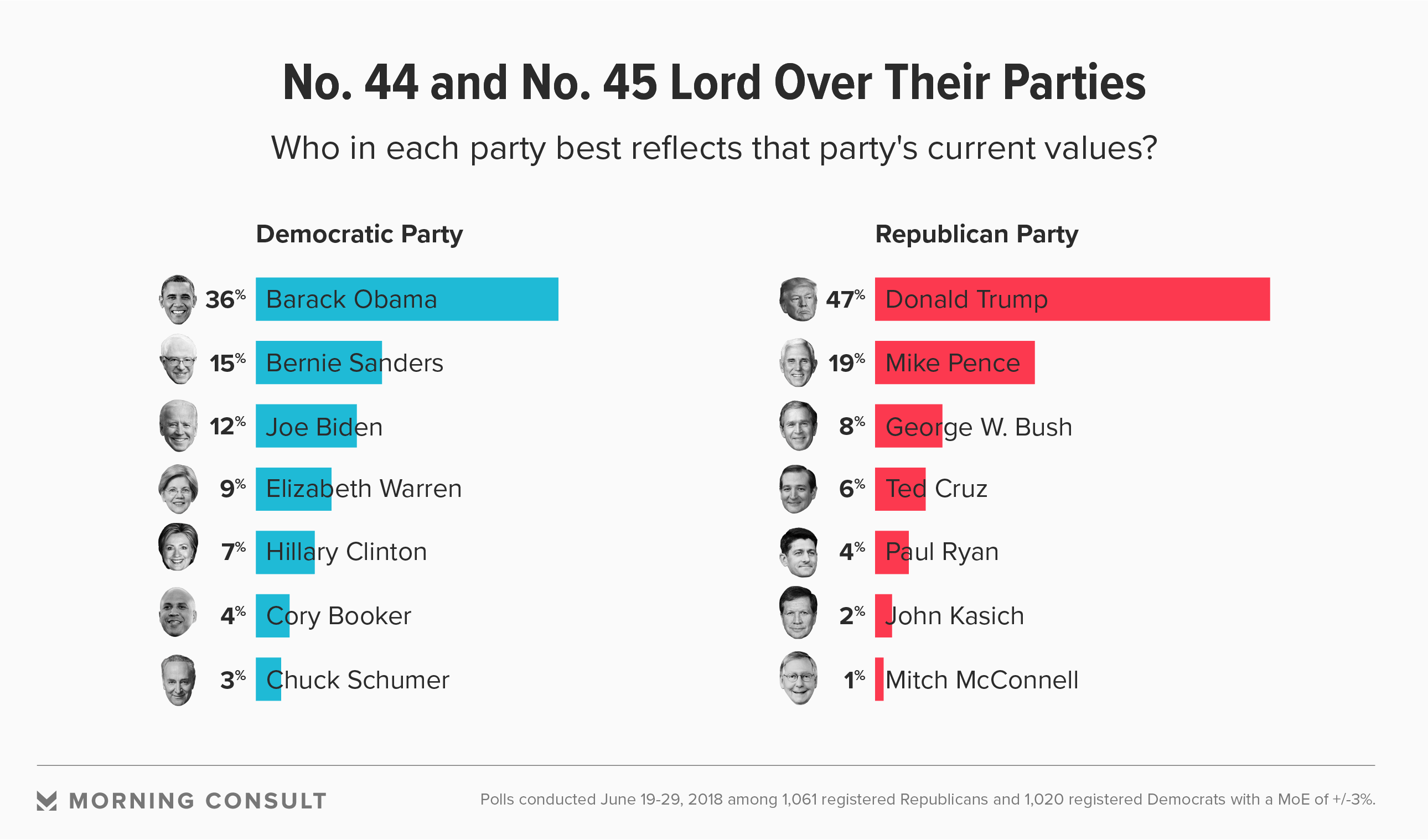 Republican responses on the question underscore the influence Trump currently wields within the party. Nearly half (47 percent) of GOP voters said he best reflects the GOP’s values, up 9 points from the 2017 survey. Republicans were also slightly more likely to say the party should be molded in the president’s image: Sixty percent said he was the person who should best reflect the party’s values, up from 55 percent a year ago.