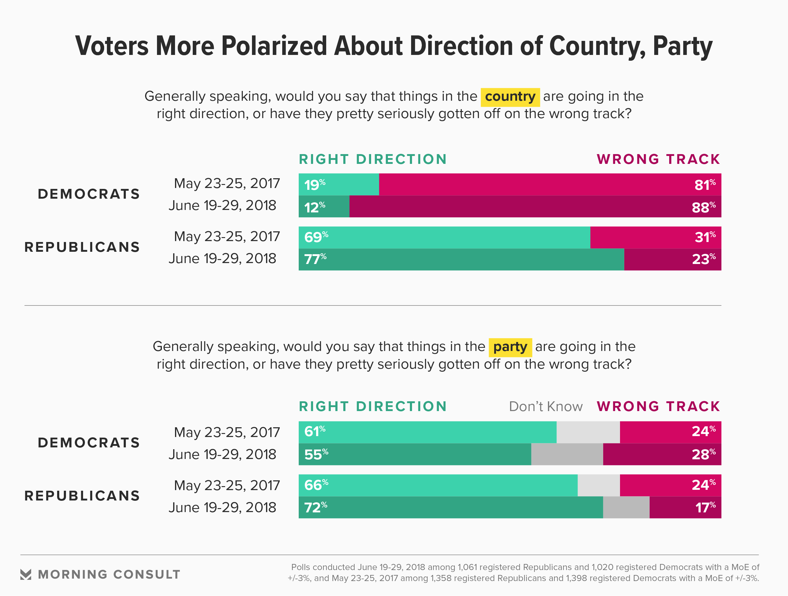 But Democrats are increasingly more likely to see the glass as half empty when it comes to the United States: Eighty-eight percent of respondents in the Democratic survey said things had gotten off on the wrong track in the country, up 7 points from 2017. And while a majority of Democrats believe their party is heading in the right direction, more than a quarter (28 percent) said the party was off the rails, 4 points higher than last year.