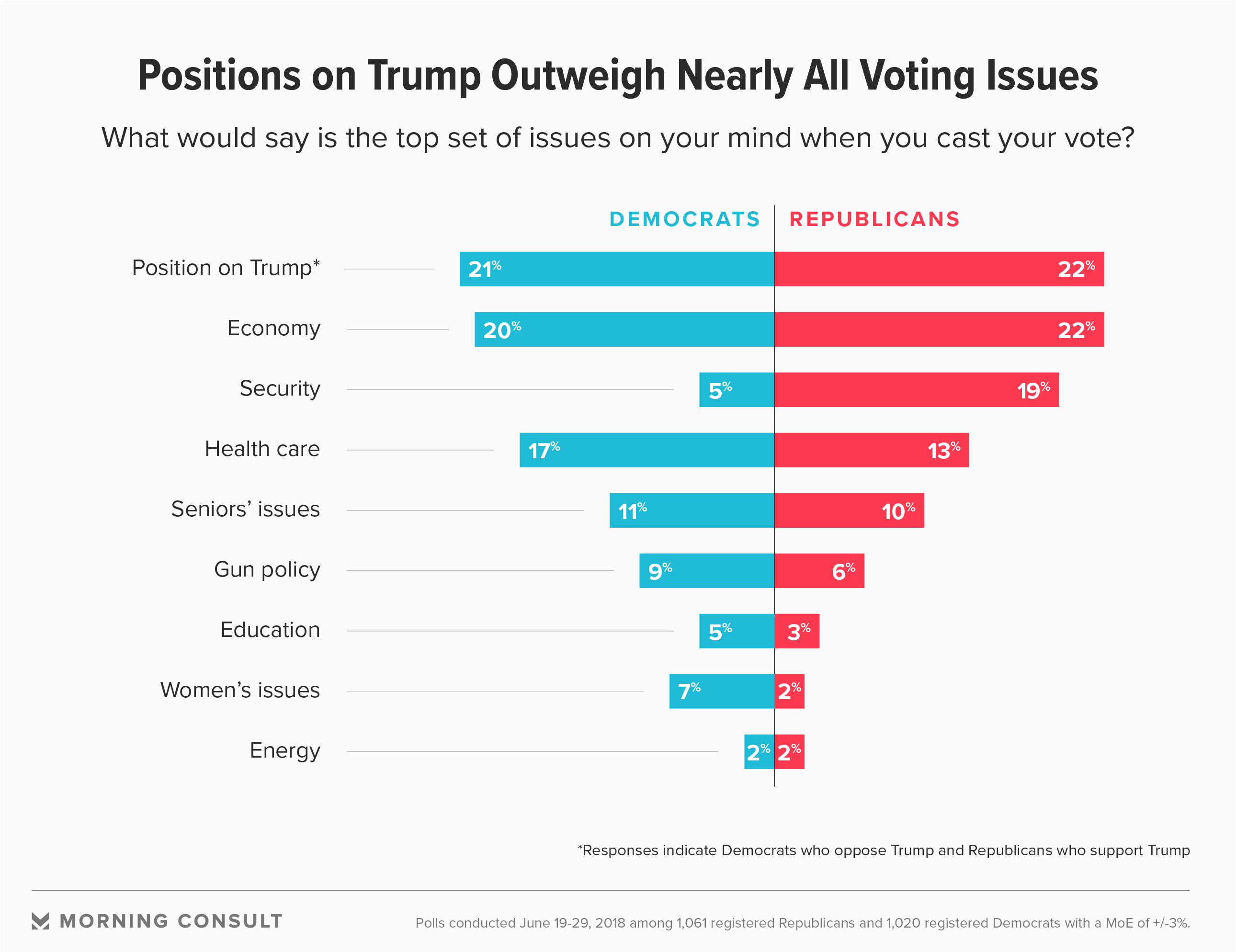 President Donald Trump is revered by Republicans and detested by Democrats -- and what congressional candidates think of the president is more important than nearly every policy issue polled, including security and health care, for both Republicans and Democrats in the third edition of Morning Consult’s State of the Parties survey.