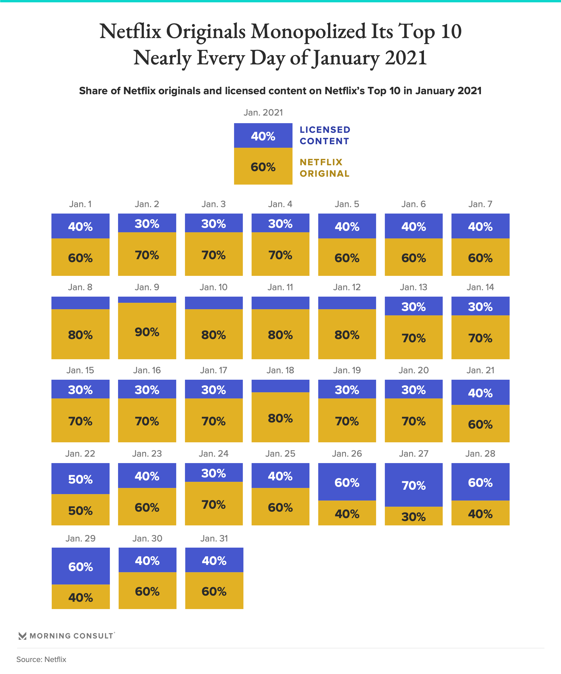 Daily Morning Consult analysis of the service’s U.S. Top 10 rankings found that 62 percent of the titles were Netflix originals. Netflix calculates the list based on how many accounts watch at least two minutes of a show.