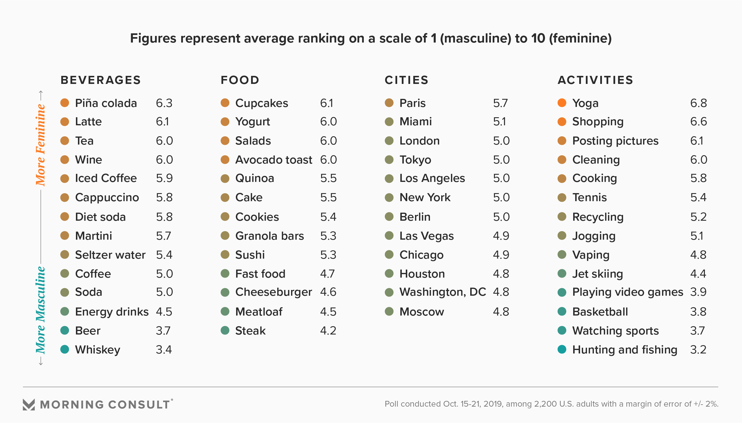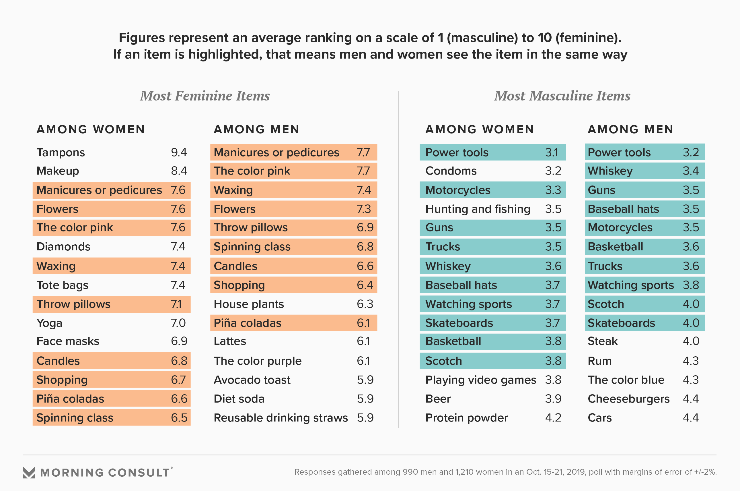 A new Morning Consult poll sought to determine whether a list of miscellaneous products and activities, from hand sanitizer to posting pictures on social media, were perceived as more masculine or feminine. And although experts said ascribing a gender association to objects is quite natural, it could create obstacles for brands trying to market goods and services heavily associated with one gender, such as diet colas, especially among male consumers.