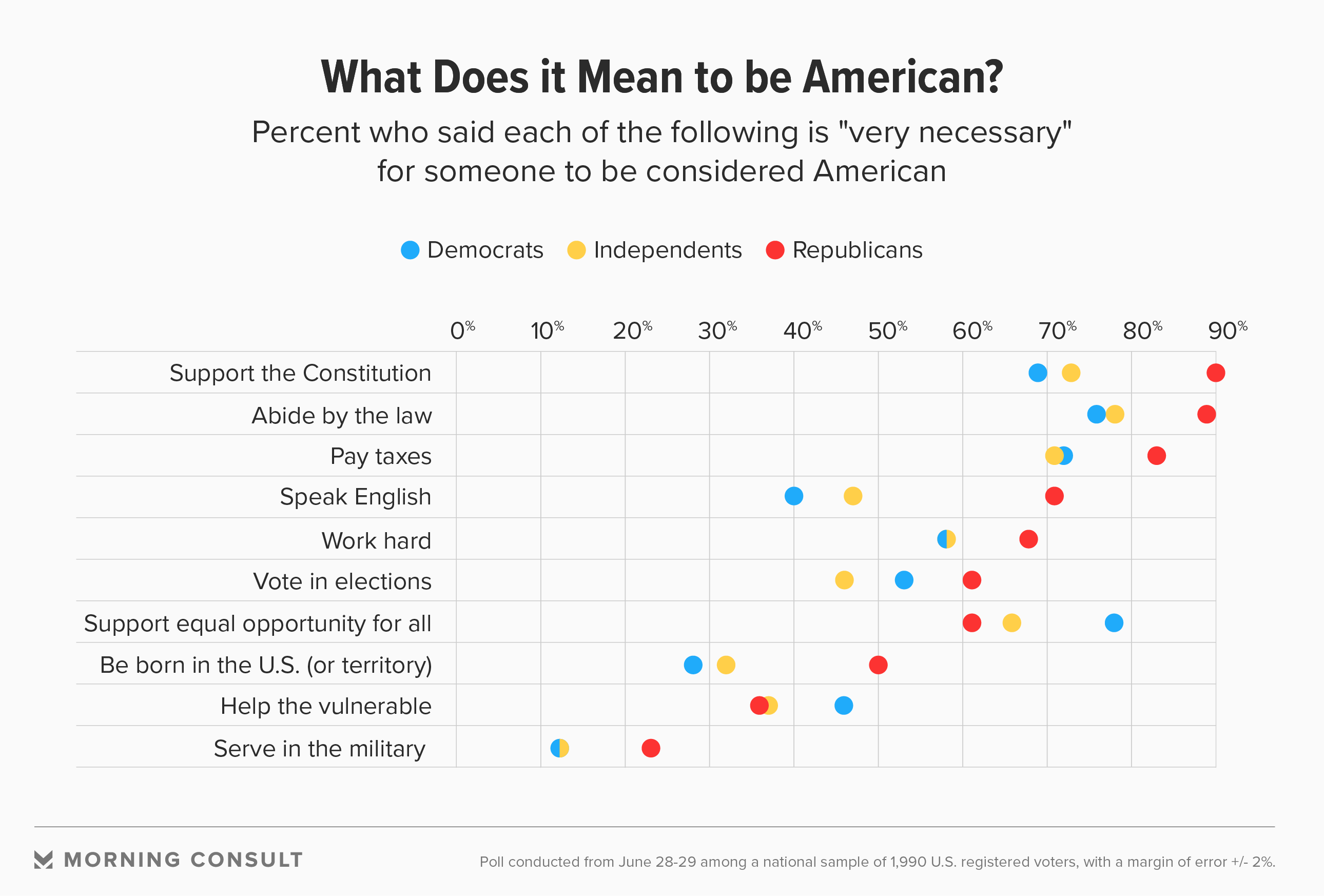 Government officials will be happy to hear that following the law (81 percent), supporting the Constitution (77 percent) and paying taxes (75 percent) topped respondents’ lists for being “very necessary” for being American in the poll, which was conducted July 28-29. Those attributes received majority support from people affiliated with both parties in the survey of 1,990 registered voters.