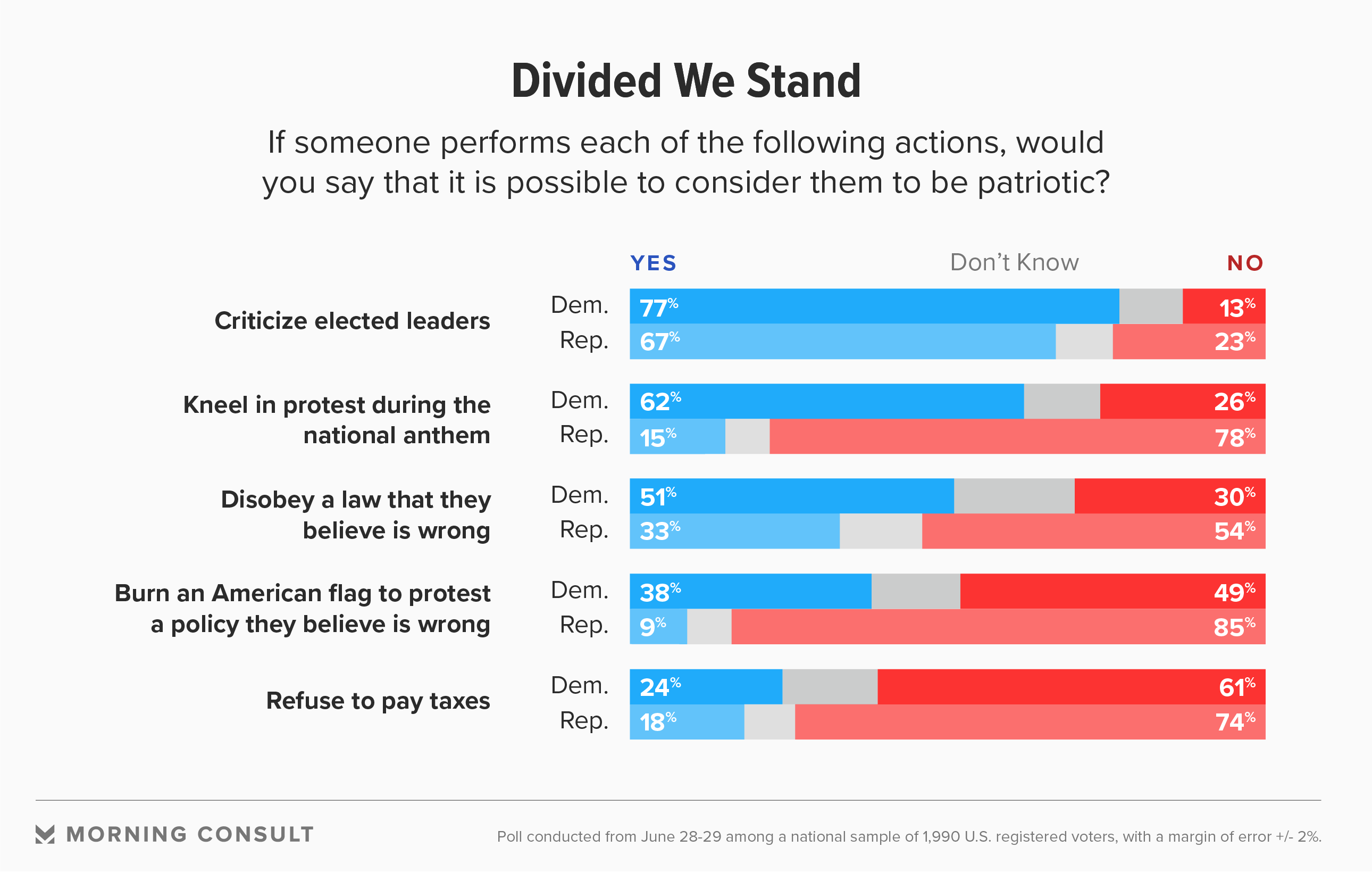 Political divisiveness also emerged when voters were asked specifically whether certain acts are patriotic. A slim majority (51 percent) of Democrats said someone who disobeys a law that he or she believes is wrong can still be patriotic, but most Republicans (54 percent) said the opposite, according to the poll, which has a margin of error of plus or minus 2 percentage points.