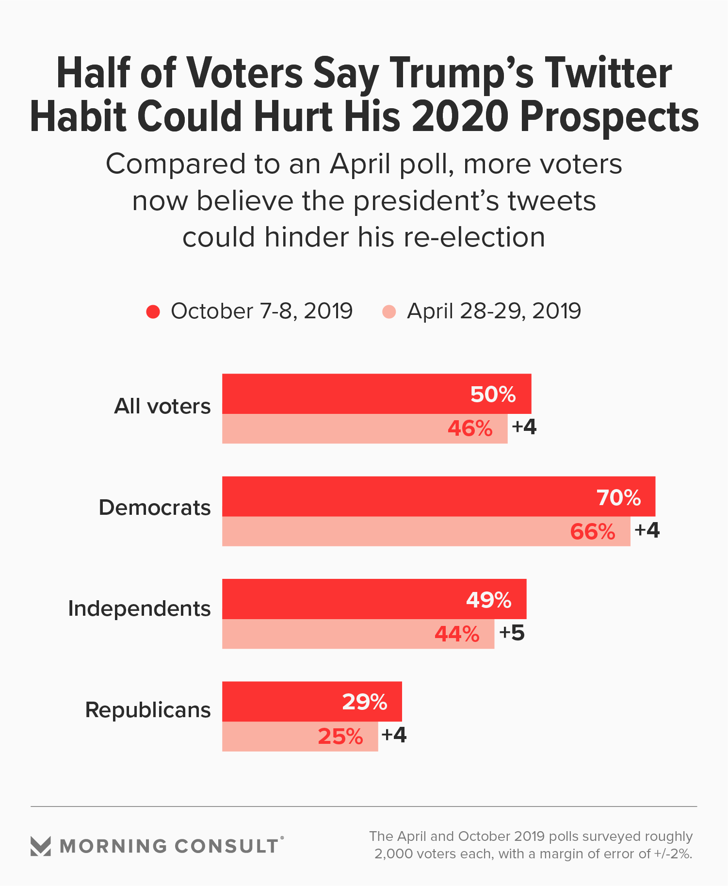And looking ahead to 2020, 50 percent of voters, including 29 percent of Republican voters, said the president’s use of Twitter hurts his re-election efforts, with both shares rising 4 points since the April poll.