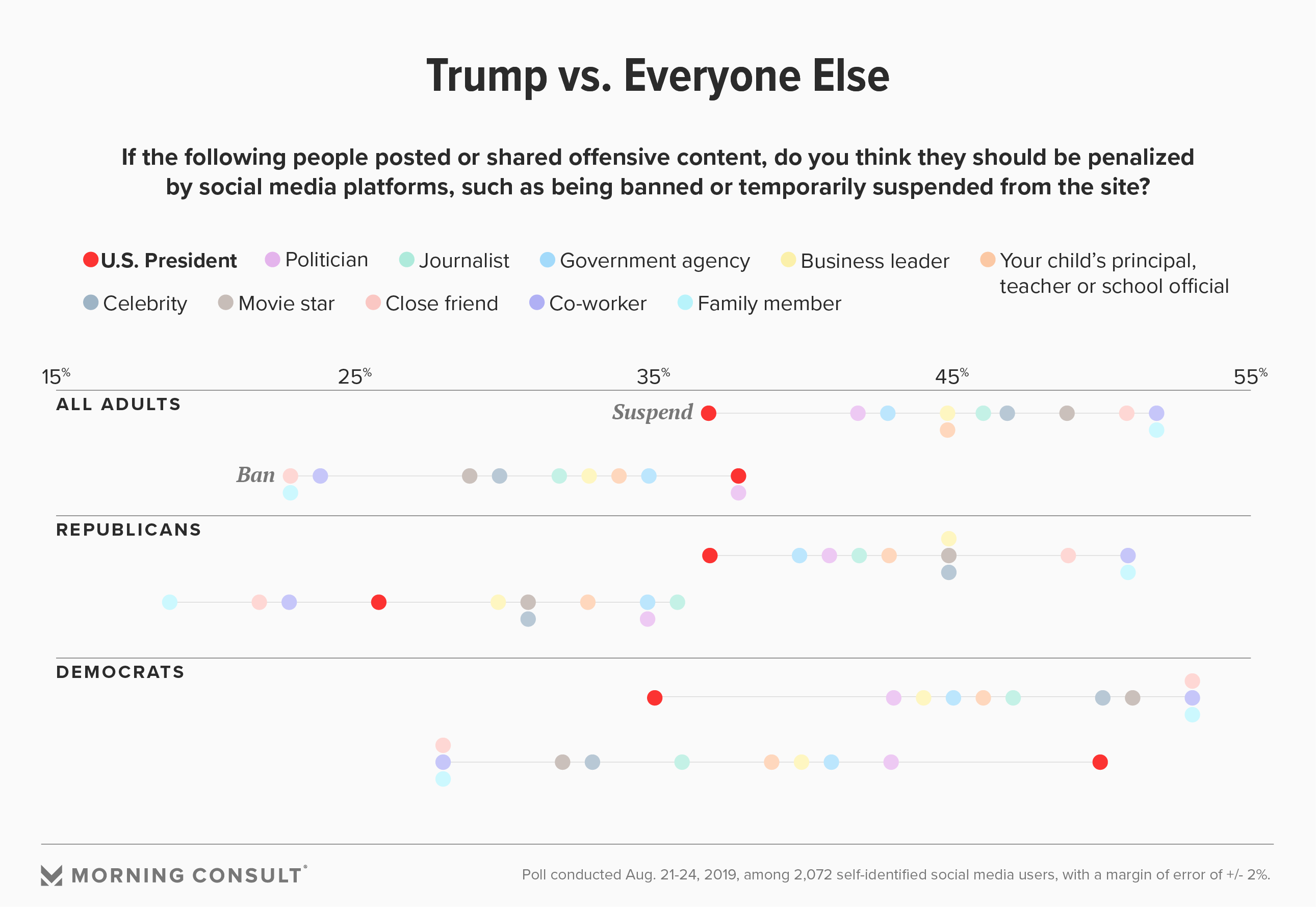 And while little difference exists between Republican and Democratic social media sentiments on whether to suspend the president’s social media account for posting or sharing offensive content, party lines are stark on permanently banning the account: Fifty percent of Democrats said the president should be banned from the platform, compared to 26 percent of Republicans.