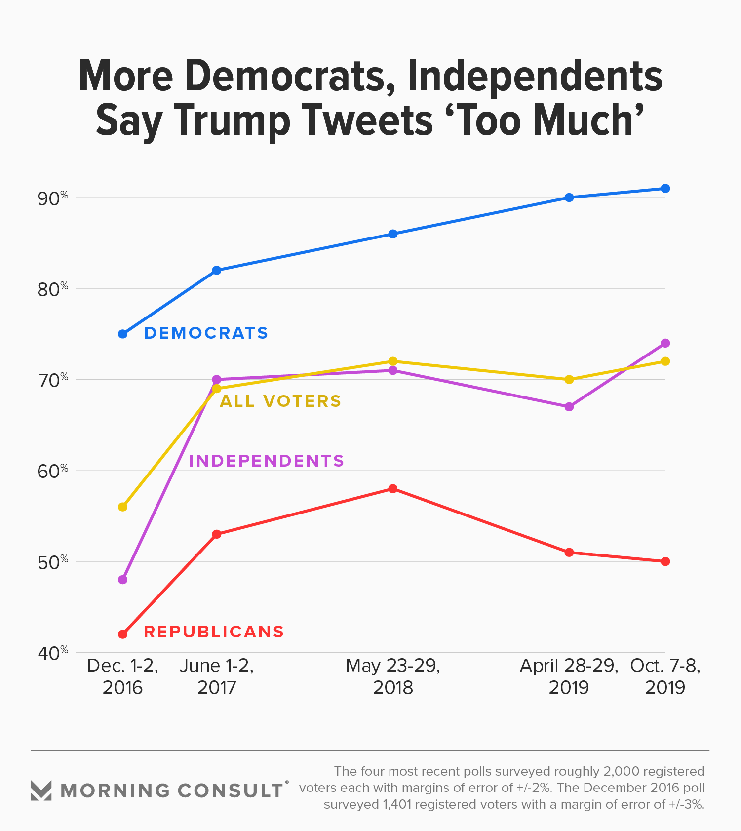 According to a new Morning Consult/Politico survey conducted Oct. 7-8, 2019 among 1,991 registered voters, 72 percent of registered voters believe Trump uses Twitter “too much” -- the same share who voiced the belief in May 2018 and up 2 percentage points from the last time the question was asked in April. The survey has a margin of error of 2 points.
