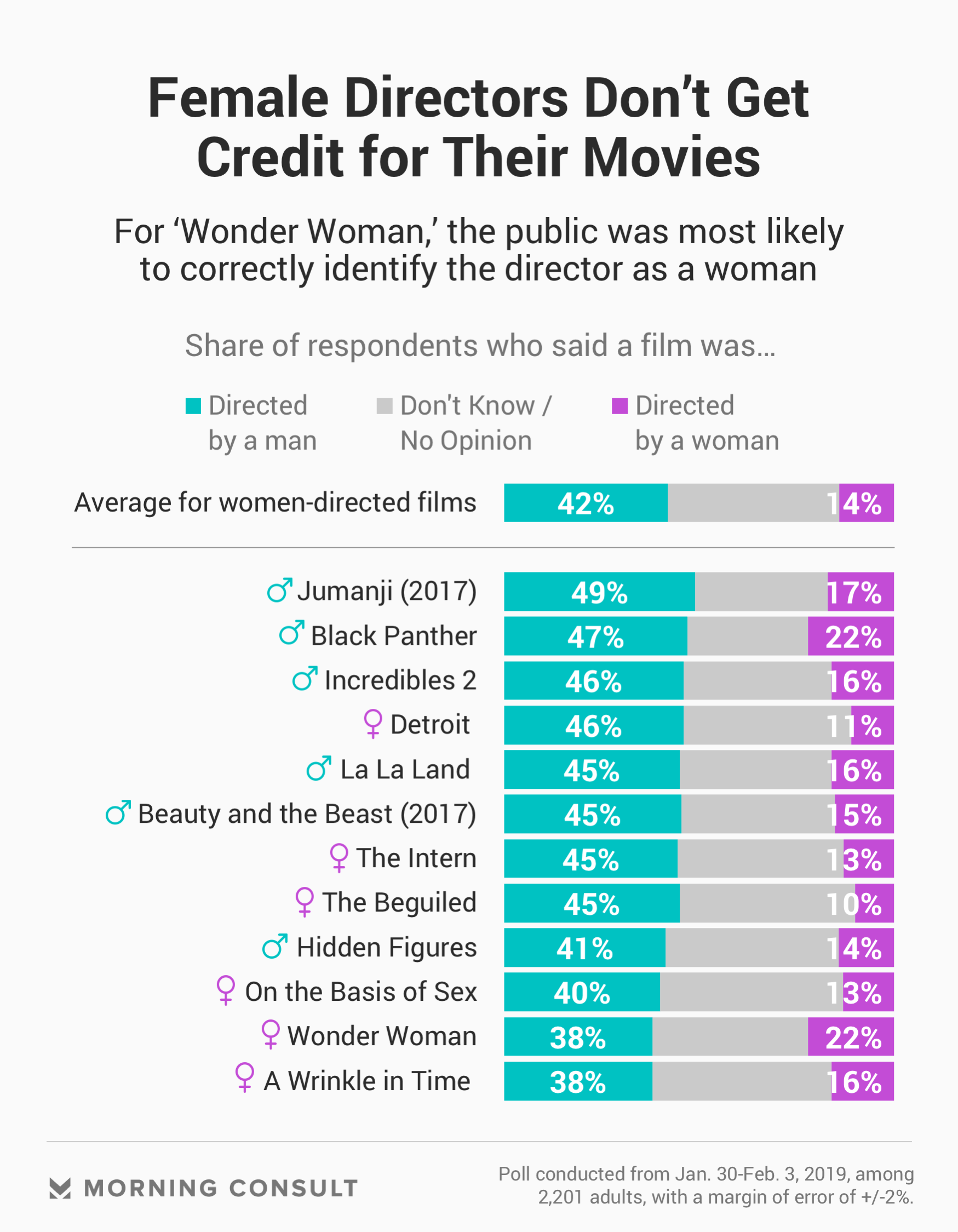 A Jan. 30-Feb. 3 Morning Consult survey of 2,201 adults showed that when given a selection of movies from recent years -- half of which were directed by men, half of which were directed by women -- respondents were on average three times more likely to say that a man directed a film that was actually directed by a woman.