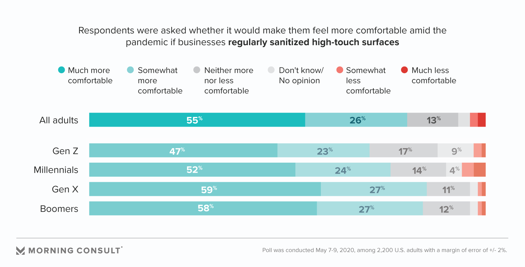 Medical experts said companies should focus on two types of ways the virus could spread: person-to-person and object-to-person. The most efficient thing that companies can do to make consumers feel safe deals with the latter: 81 percent of consumers said habitually cleaning high-traffic surfaces would make them feel more comfortable in businesses amid the coronavirus outbreak, including 55 percent who said it would make them feel “much more” comfortable.