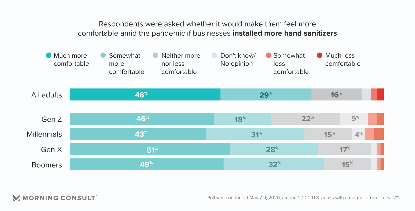 Morning Consult asked 2,200 U.S. adults which measures, including more hand sanitizer and limits on the number of customers in a store at a given time, would make them feel the most secure. They’re listed below, beginning with the action that would be most likely to make people feel safe.