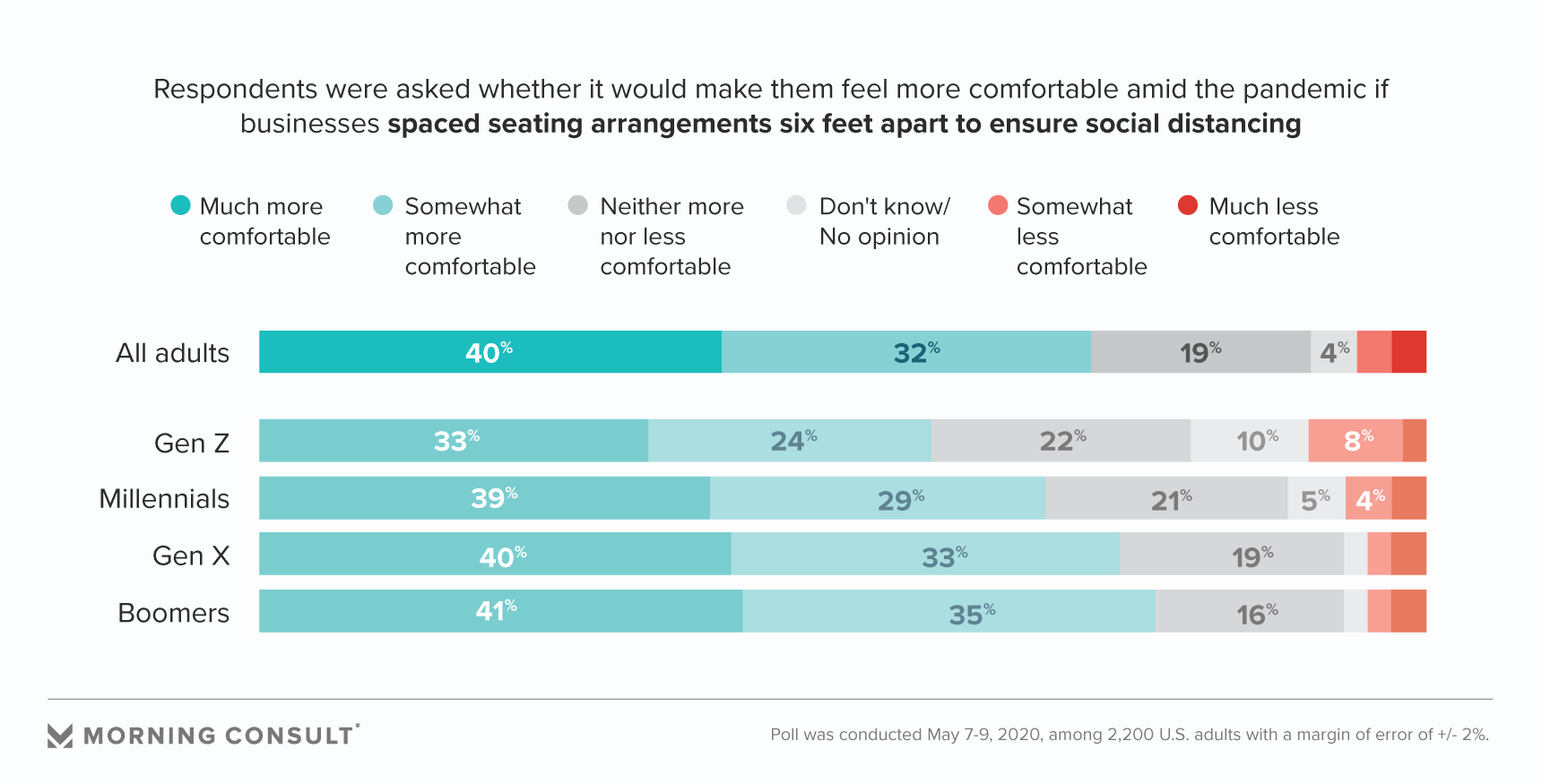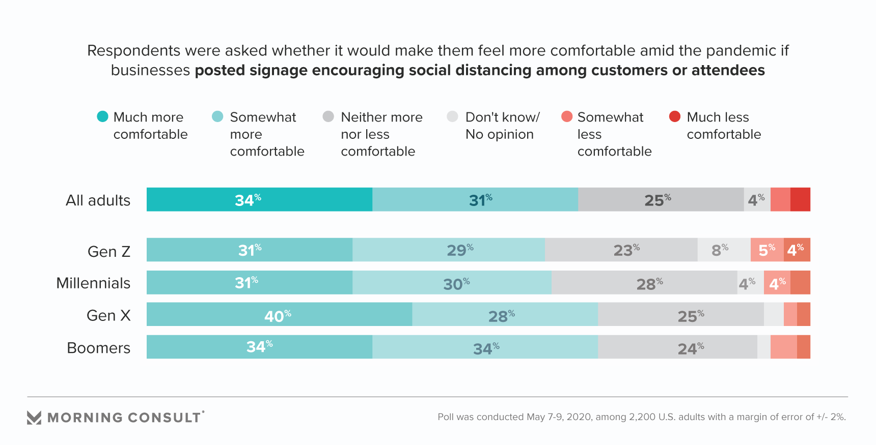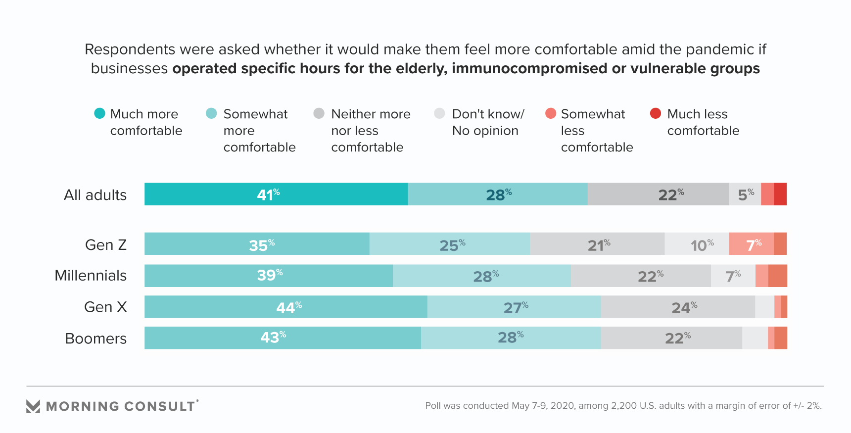 Nearly 7 in 10 (69 percent) U.S. adults, including 71 percent of baby boomers, said holding business hours just for vulnerable groups, such as the elderly or immunocompromised, to patronize would make them feel safer.