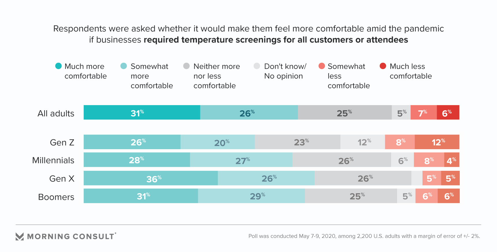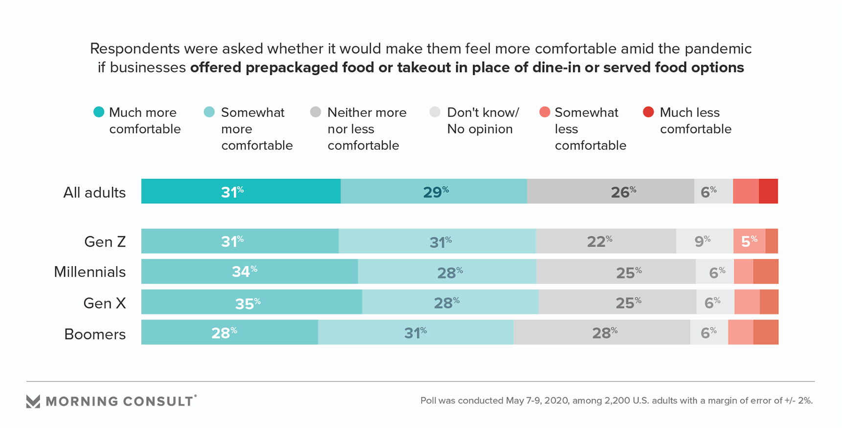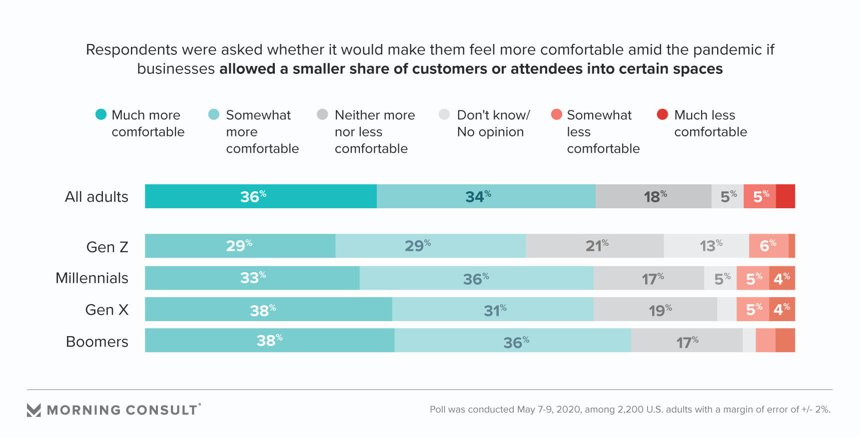 Similar to the share who said they’d feel safer if businesses physically space out patrons, 70 percent said they’d feel more comfortable if there were fewer people around as they shop or attend events.