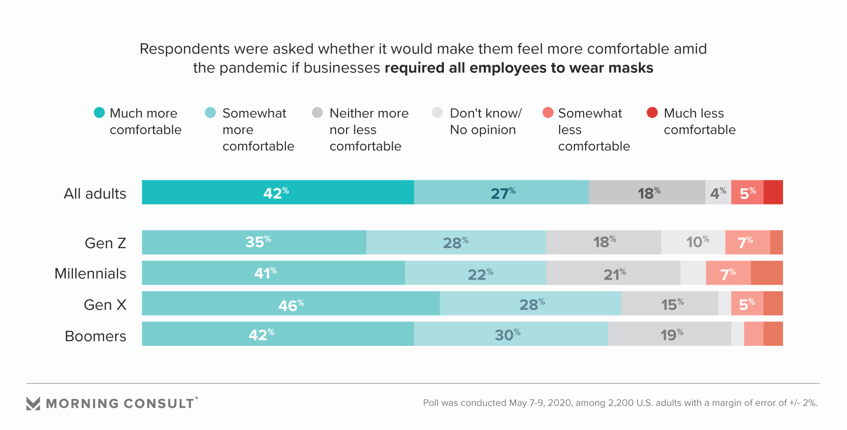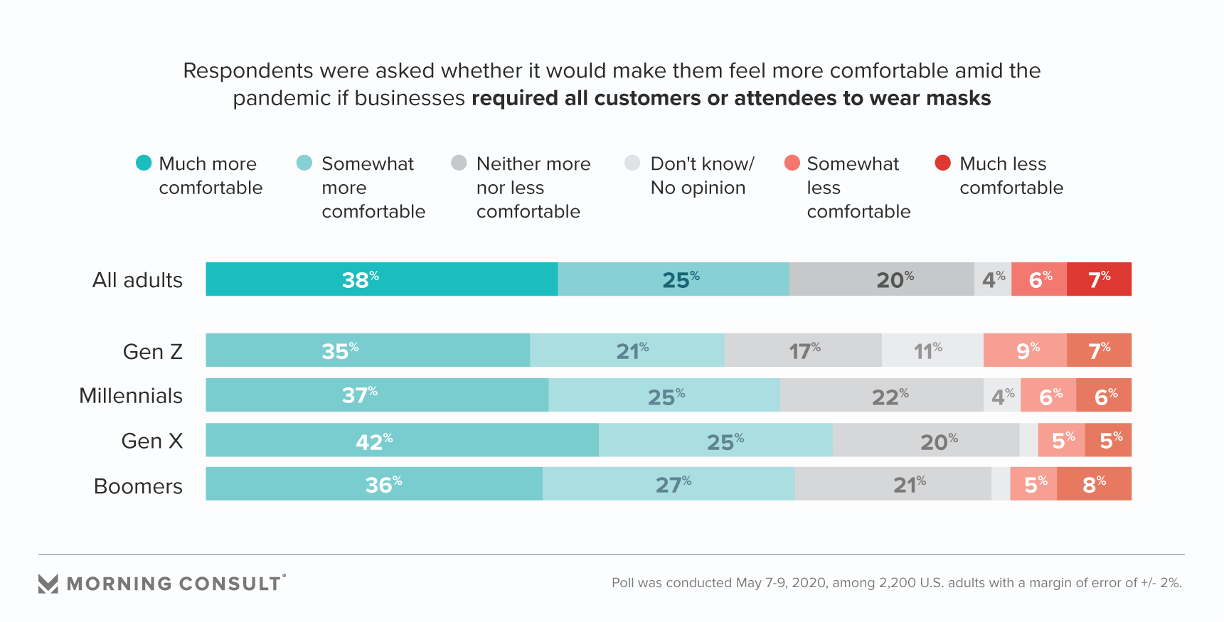Respondents said they’d feel slightly less comfortable being required to wear masks into businesses (63 percent) than if employees were mandated to wear them (69 percent). In fact, 13 percent said they would feel less safe if they were required to wear a face covering.