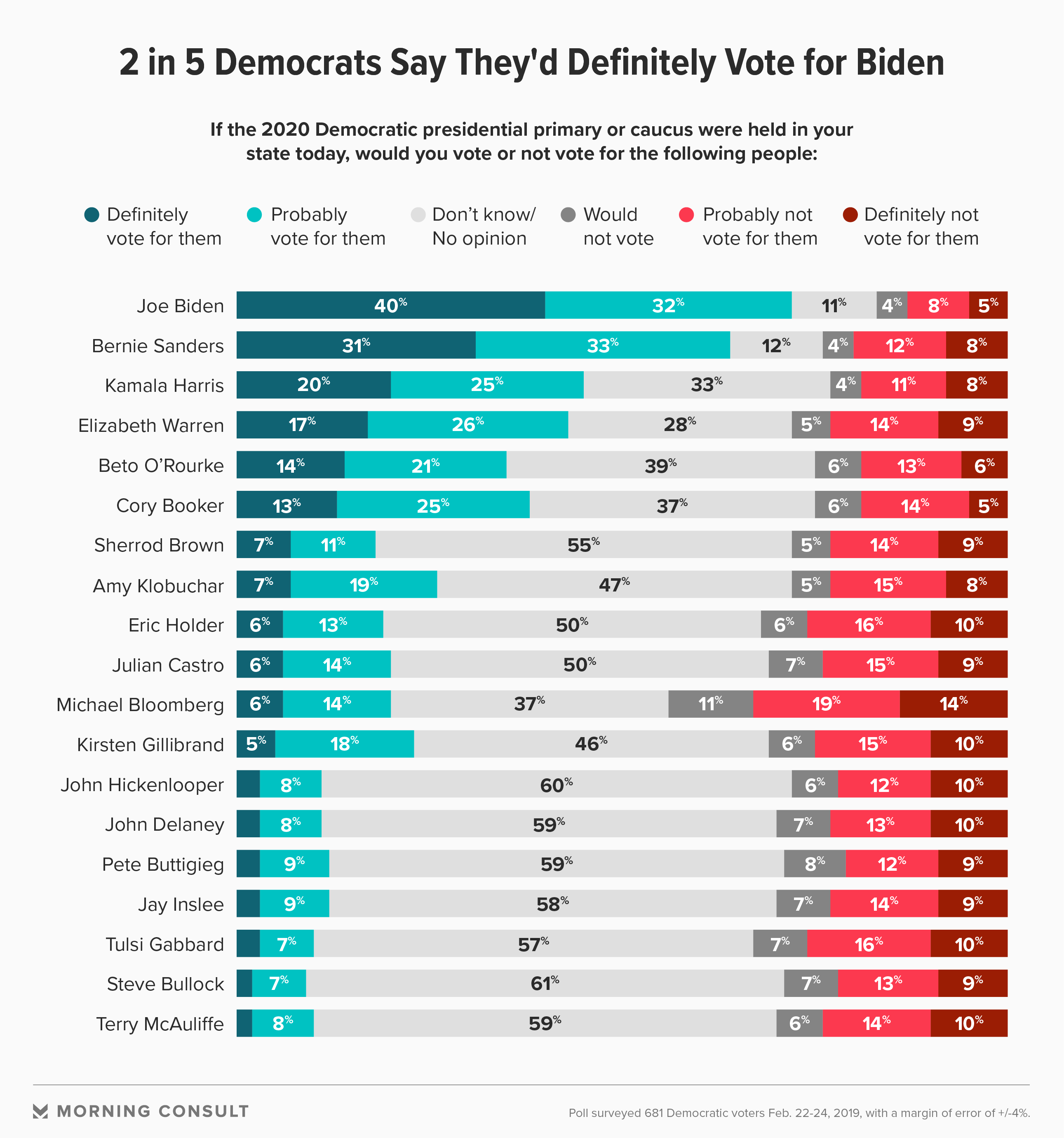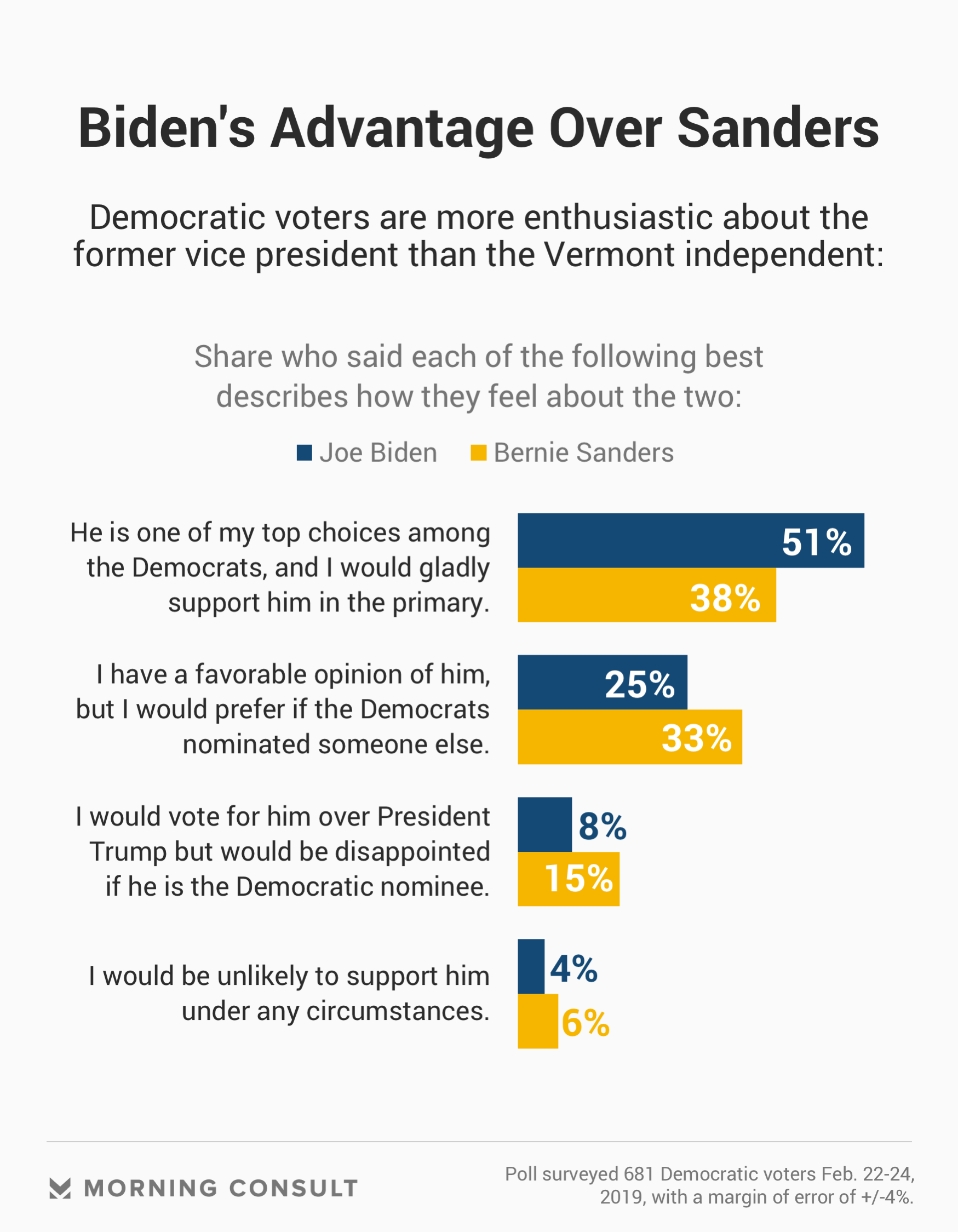 But a new national Morning Consult/Politico poll indicates that Biden, who said Tuesday that his family has signed off on a 2020 bid but that he has yet to make a final decision, may have a more decisive advantage over the Vermont independent than Morning Consult’s latest horse-race poll suggests.