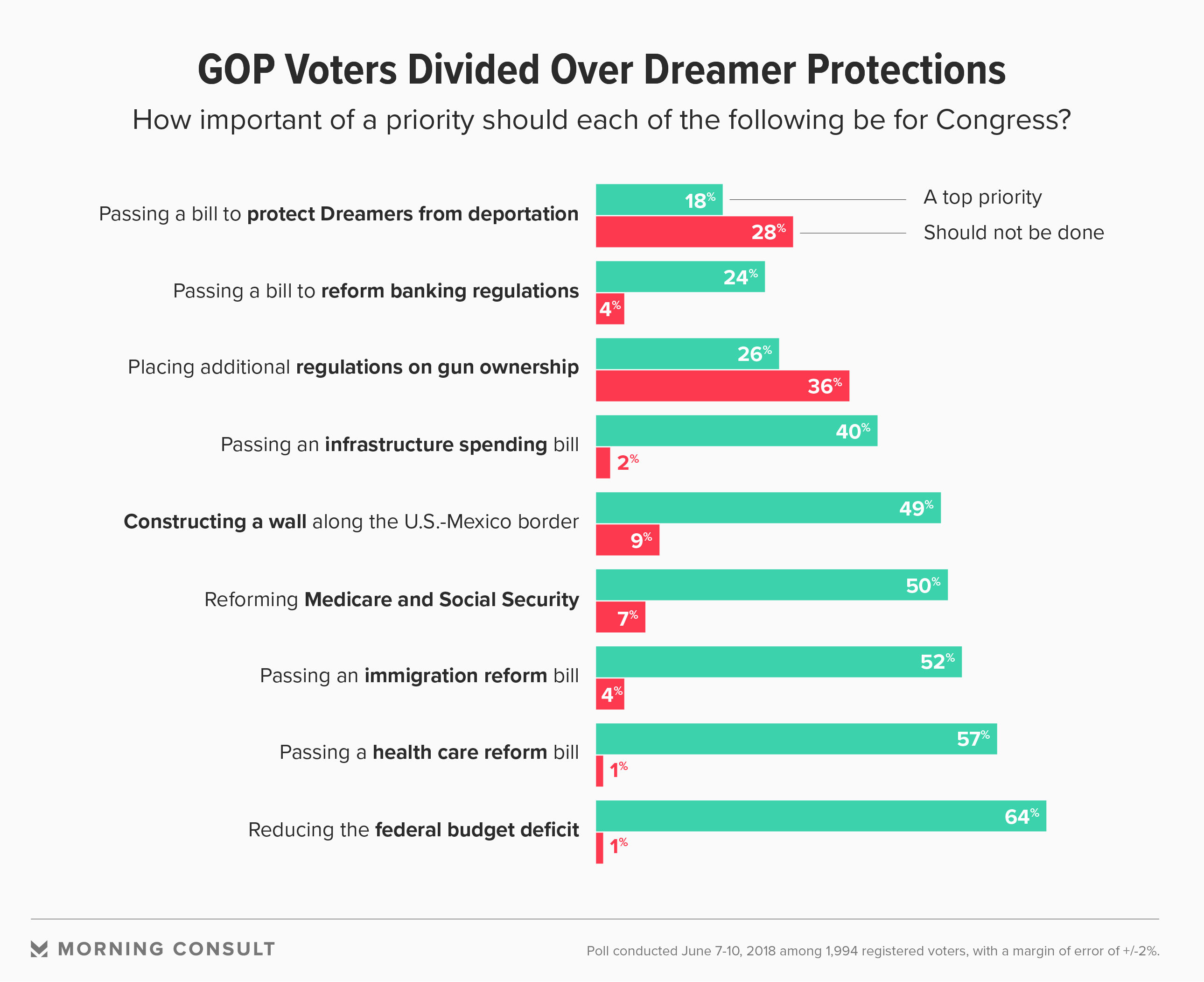 Only 18 percent of Republican voters say passing a bill that protects Dreamers from deportation should be a top priority for Congress, according to a June 7-10 Morning Consult/Politico survey of 1,994 registered voters. And a plurality of 28 percent say it shouldn't be done, making it the most divisive policy topic, along with gun control, for GOP voters sampled in the poll, which has a margin of error of plus or minus 2 percentage points.