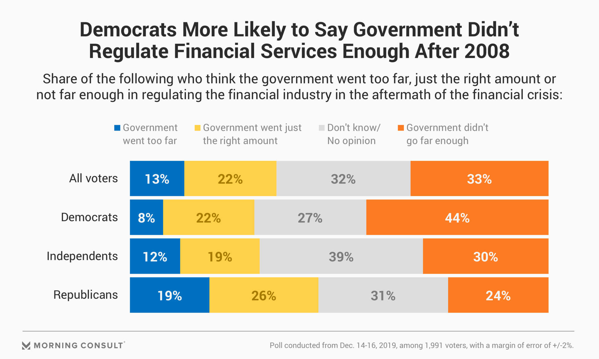 Forty-four percent of Democrats said the government didn’t go far enough in regulating the financial industry after the 2008 financial crisis. Only 8 percent said the government went too far.
