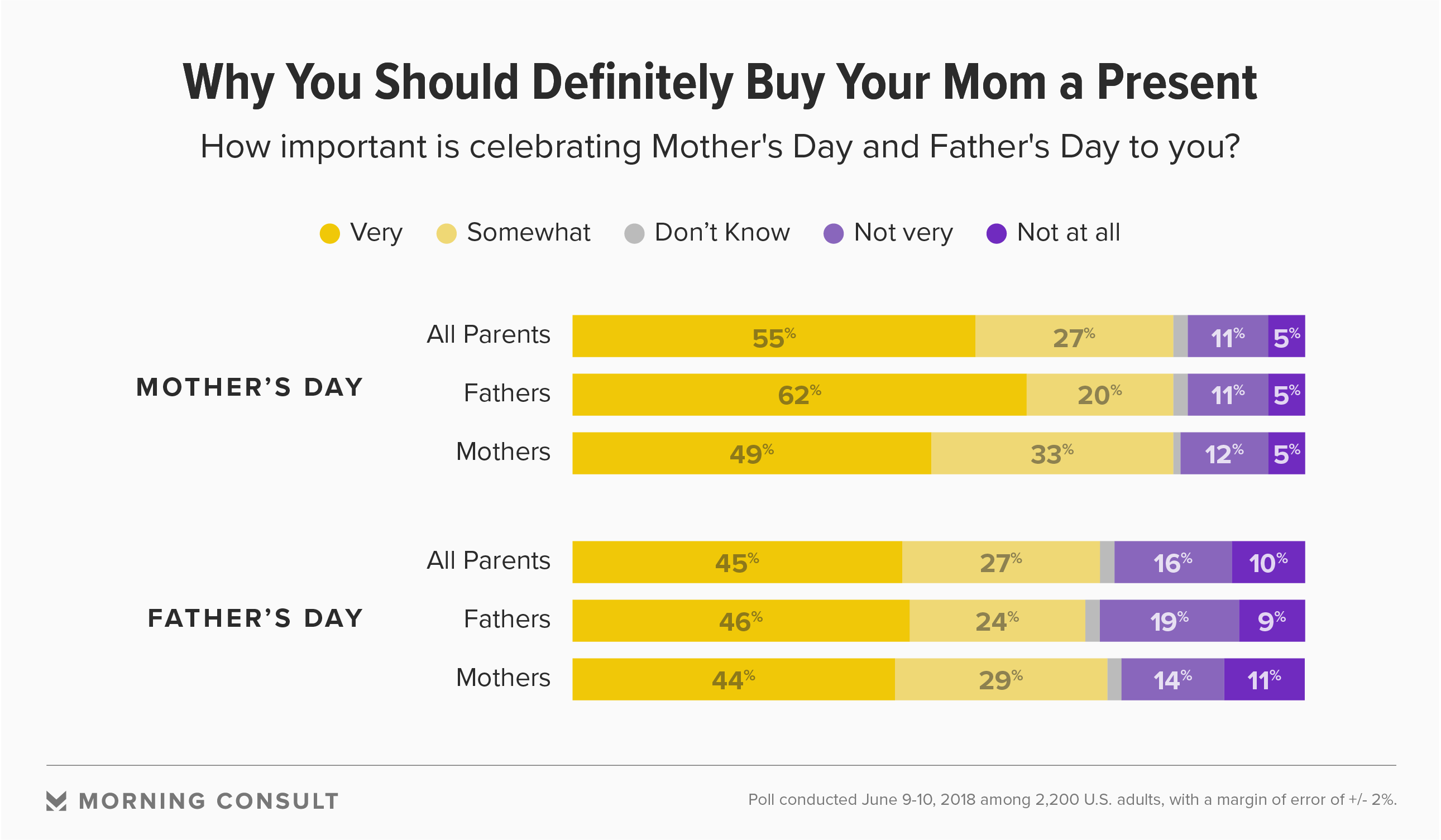 Celebrating parenthood also means more to moms than it means to dads, according to a new Morning Consult survey: 82 percent of mothers said celebrating Mother’s Day is important to them, while 70 percent of fathers said the same of their holiday.