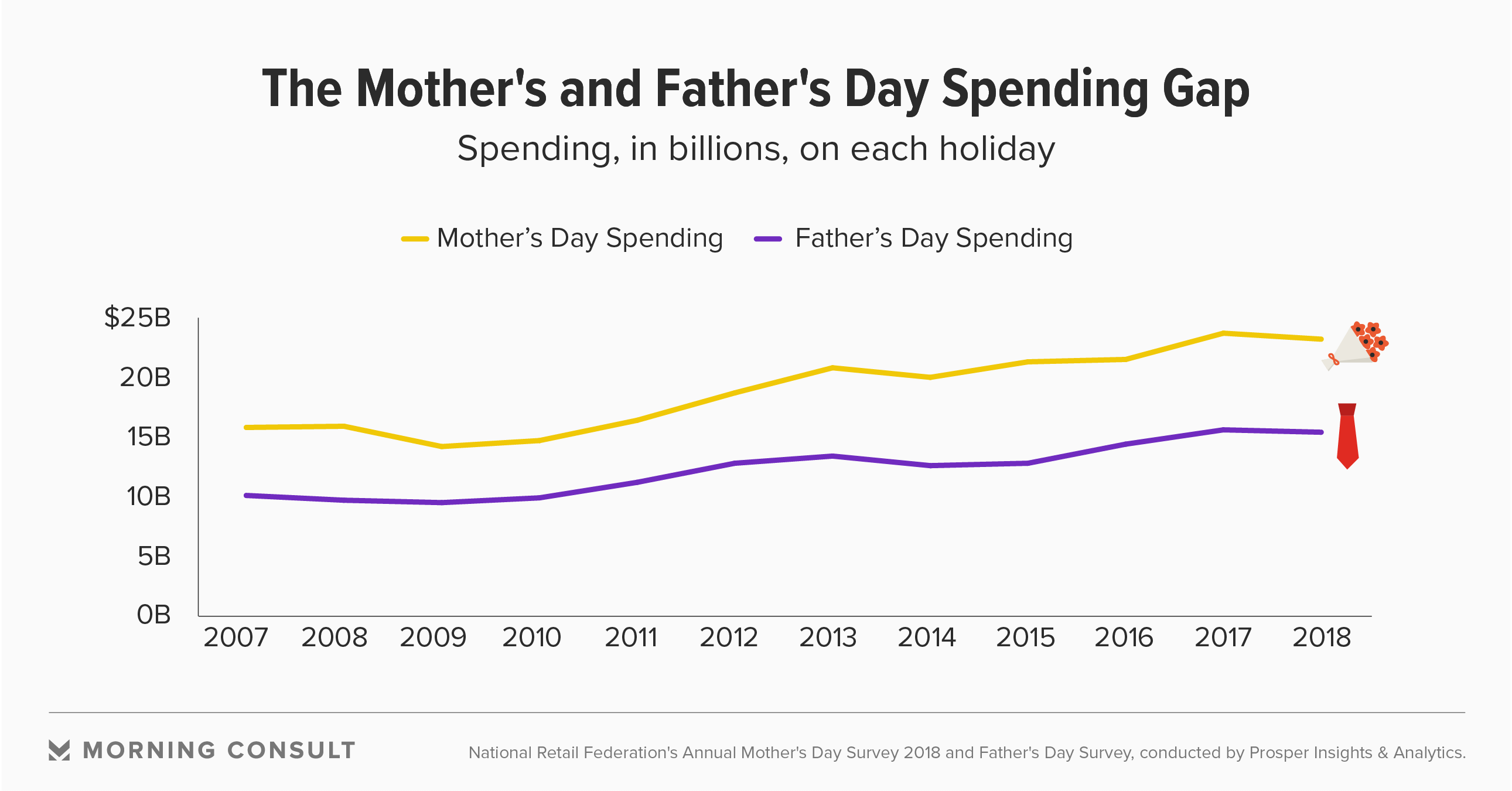 The 86 percent of the public who were estimated to celebrate Mother’s Day this year were expected to spend $23.1 billion on the holiday, 51 percent more than spending forecasts for Father’s Day this Sunday ($15.3 billion), according to the NRF, a retail trade association. That’s a ratio that’s stayed fairly constant since 2007.
