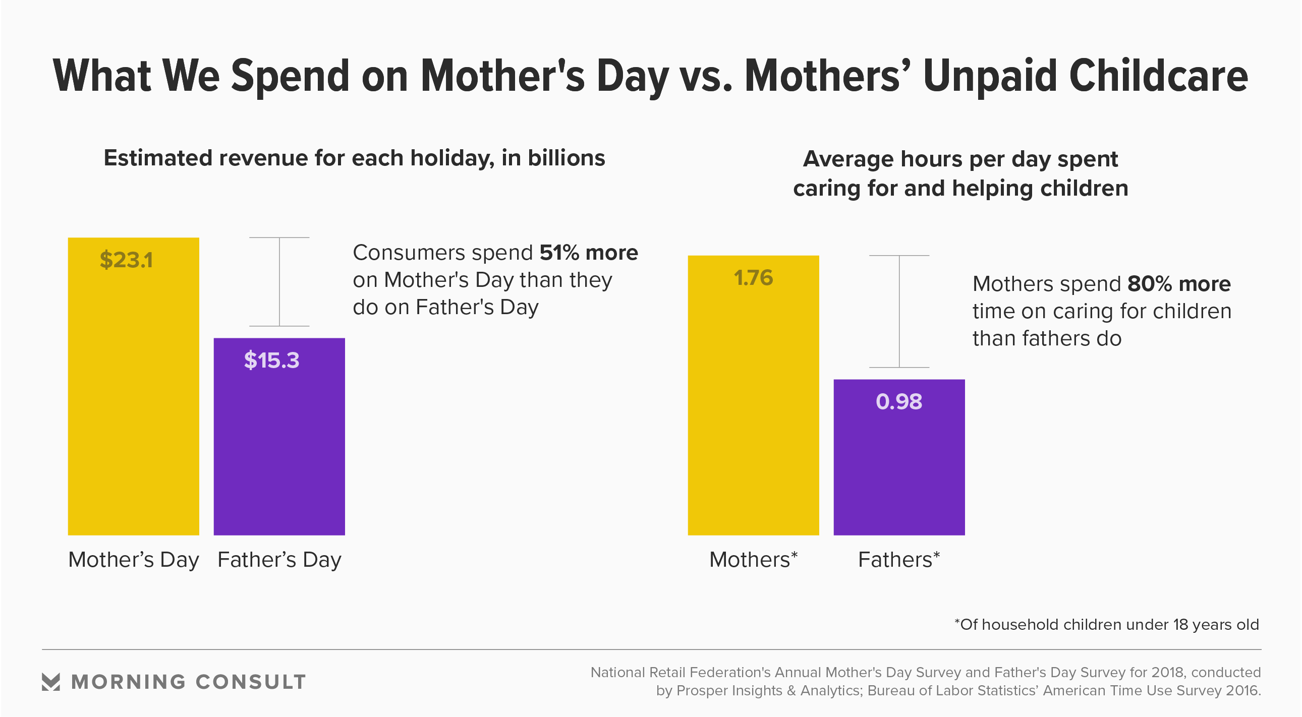 The public would need to spend $4.44 billion more on Mother’s Day than on Father’s Day if it hoped to match the ratio of holiday spending with that of child care. That’s $49 more for each mom.
