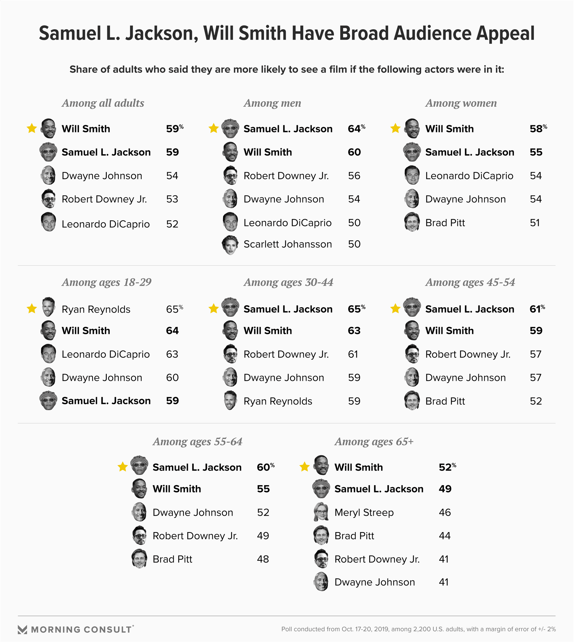 The poll, which has a margin of error of 2 percentage points, found that Samuel L. Jackson and Will Smith generated the most interest among the general population, with 59 percent of respondents saying they would be more likely to see a film if either actor were in it.
