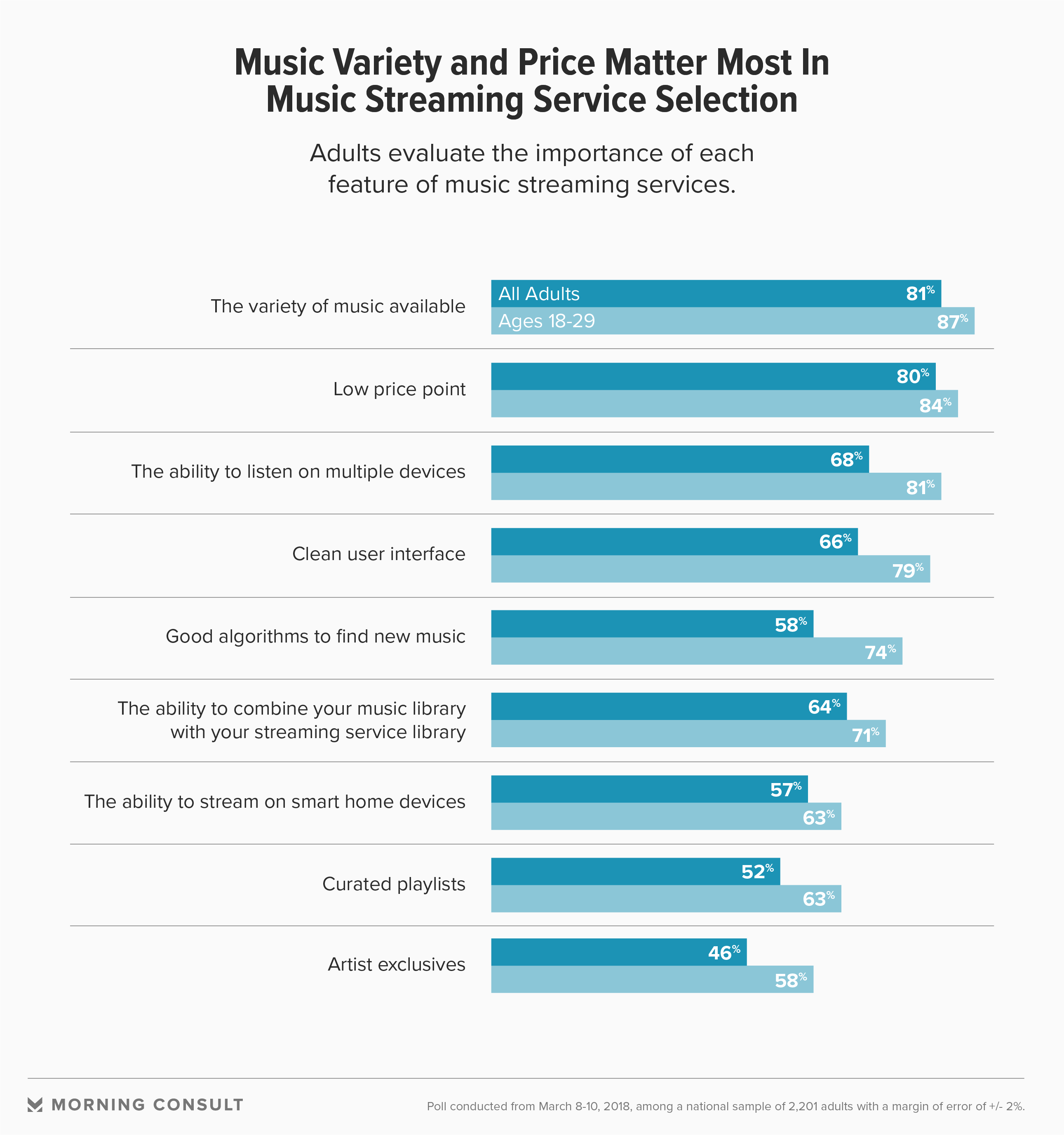 Of 971 music streaming users in the poll, 50 percent said the compatibility of the streaming service with smart home devices would likely make them switch services. That percentage increases to 53 percent among ages 18-29. The margin of error for the subsample is plus or minus 3 percentage points.