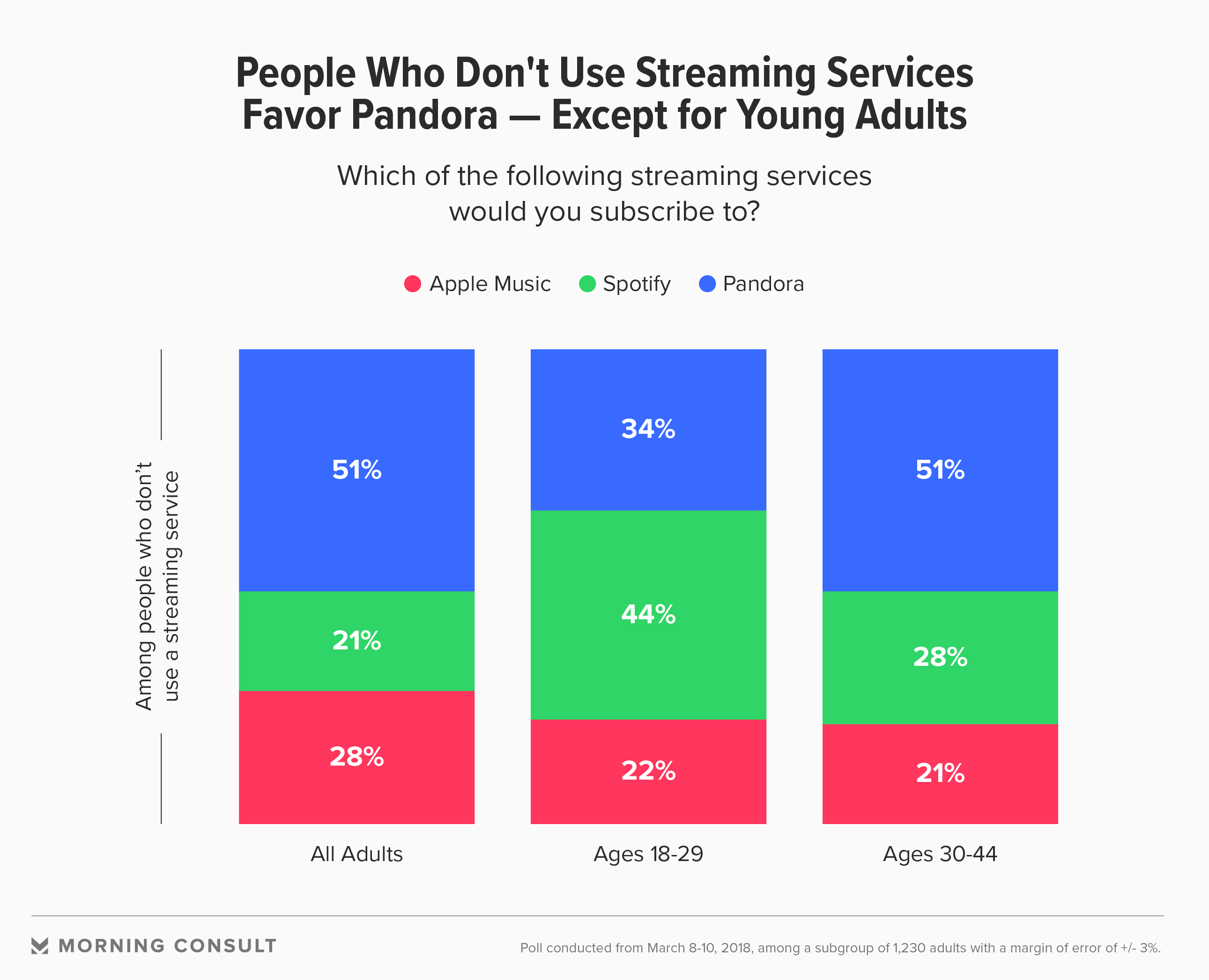 But among young adults ages 18-29, Spotify and Pandora were about equally favored: 43 percent said they subscribe to Spotify, and 44 percent said they subscribe to Pandora, while 28 percent used Apple Music. The poll has a margin of error of plus or minus 2 percentage points.
