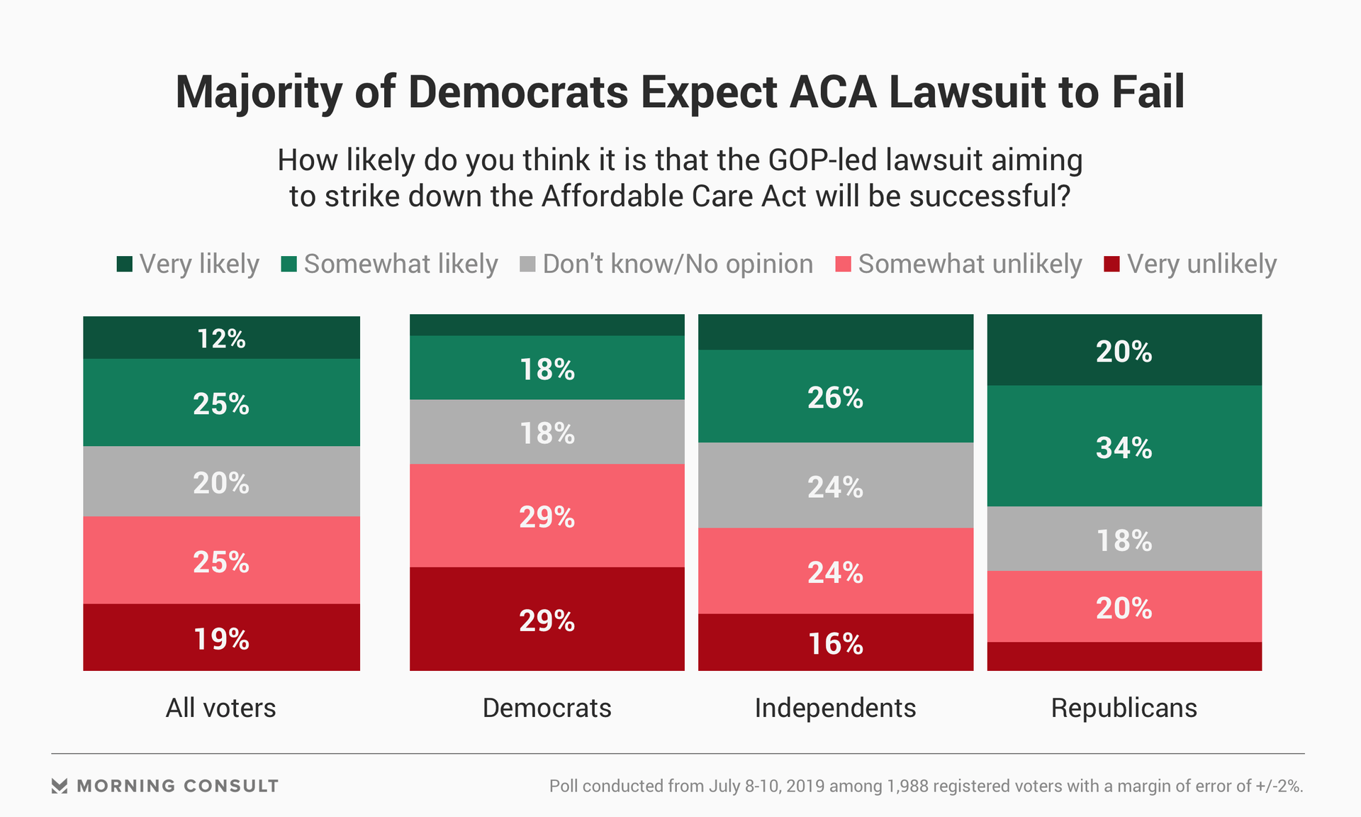 Across the aisle, about a quarter (24 percent) of Democrats say the lawsuit is likely to succeed. While party leaders have recently been more vocal about their opposition to the case, they are cognizant that voters remain focused on issues taking shape in the 2020 primary, such as “Medicare for All” and other pathways to universal coverage.