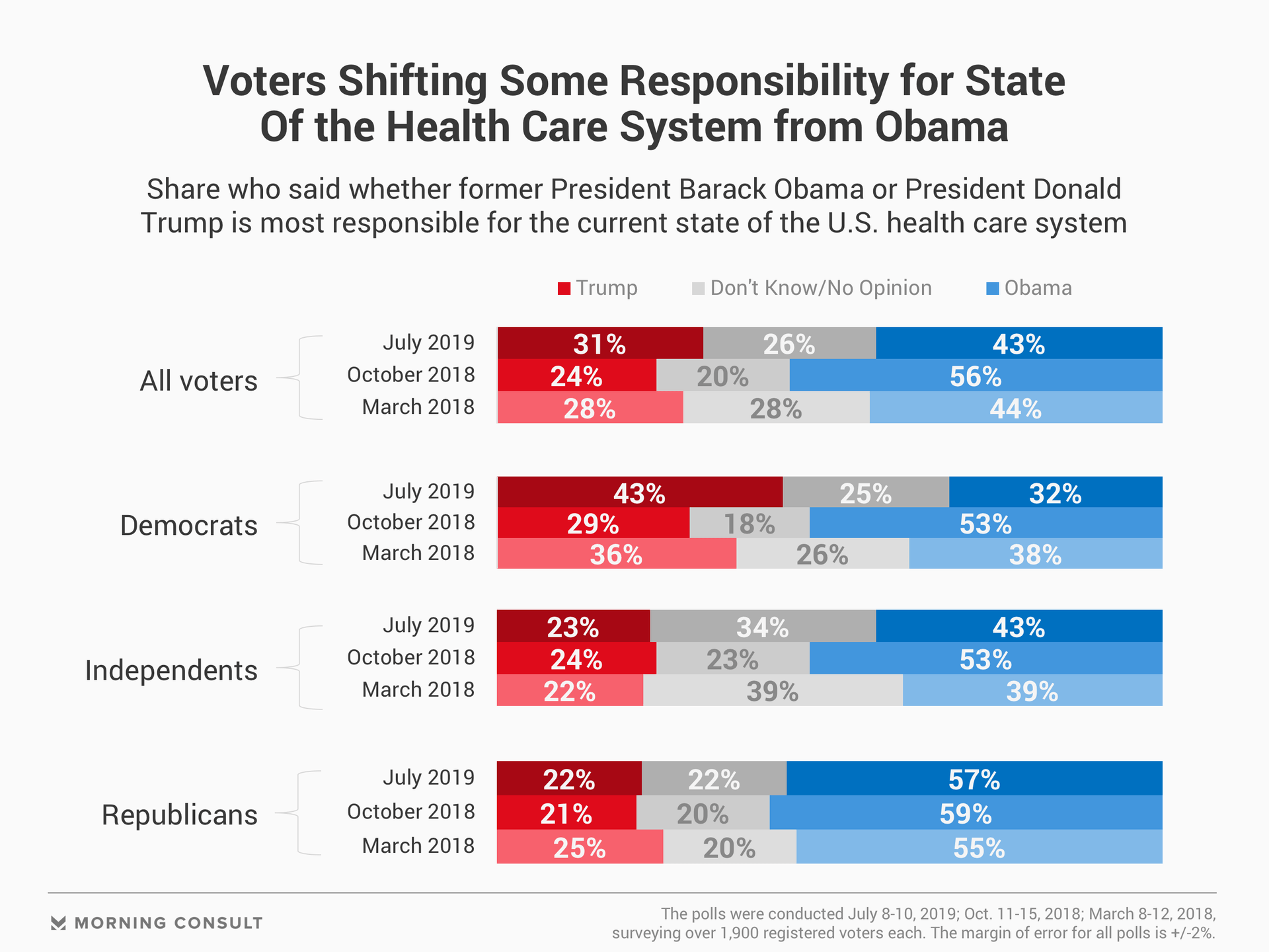 - Voters assign Obama more responsibility for the current state of the health care system than Trump, by a margin of 12 points.