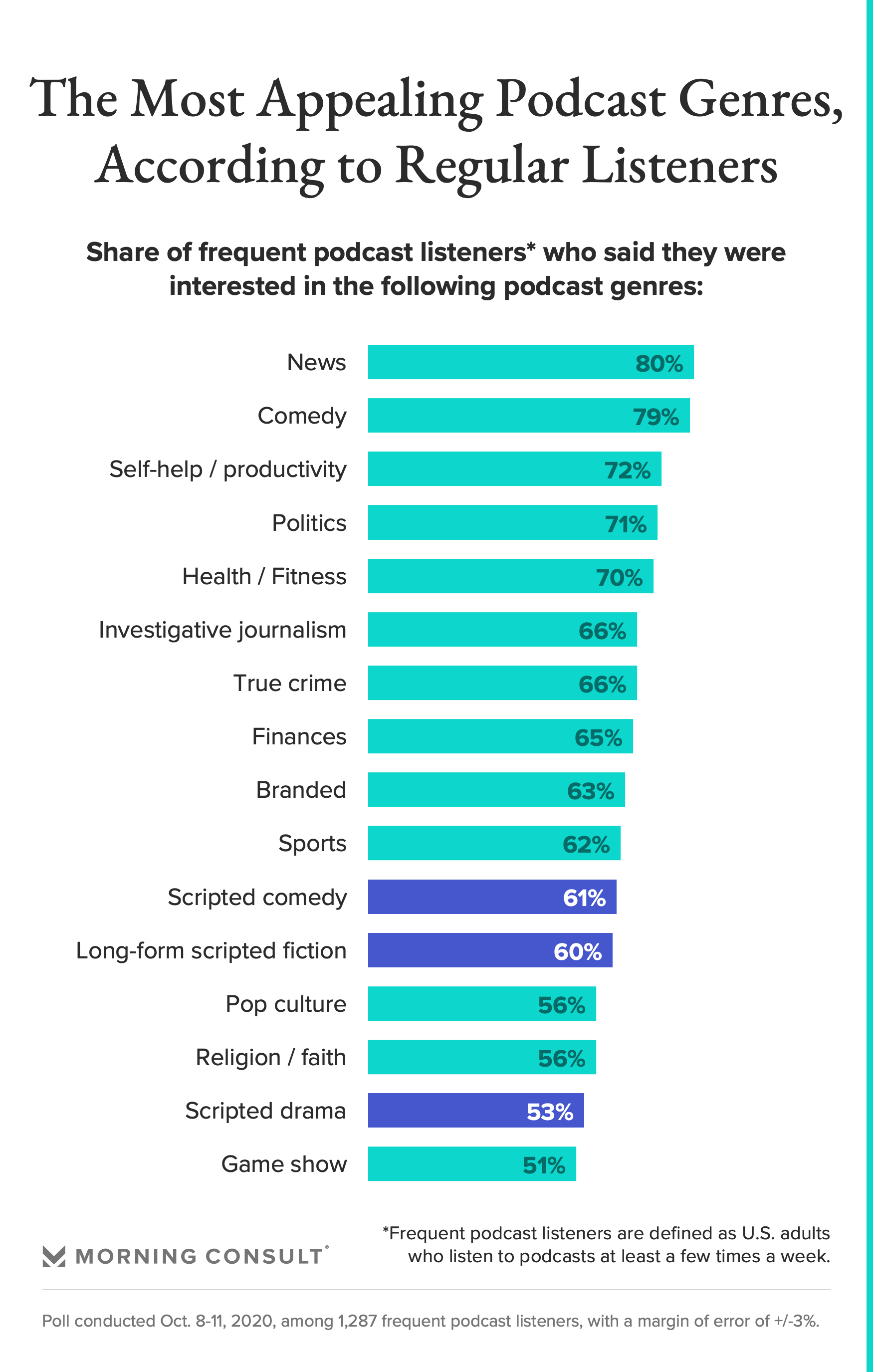 An Oct. 8-11 Morning Consult survey found that among 1,287 frequent podcast listeners, defined as U.S. adults who listen to podcasts at least a few times a week, scripted podcasts drew less interest than genres such as news and comedy. That statistic is somewhat unsurprising to those working in the scripted podcast space, which includes short-form scripted comedy or drama and long-form scripted fiction that tells a story over multiple episodes.
