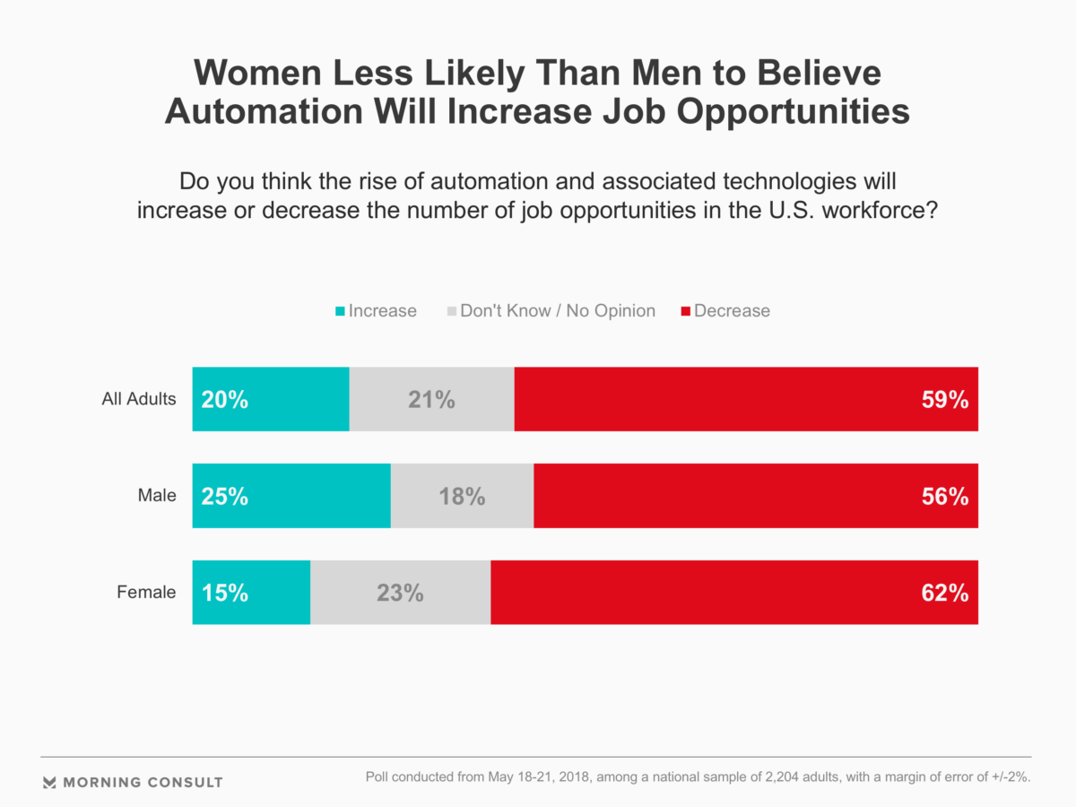 A nationwide poll conducted May 18-21 found that 15 percent of women believe automation and associated technologies would increase job opportunities, while 62 percent said it would decrease job options. The same Morning Consult survey found that 25 percent of men believed the number of available job opportunities would increase, while 56 percent said increased automation would limit the number of available jobs.