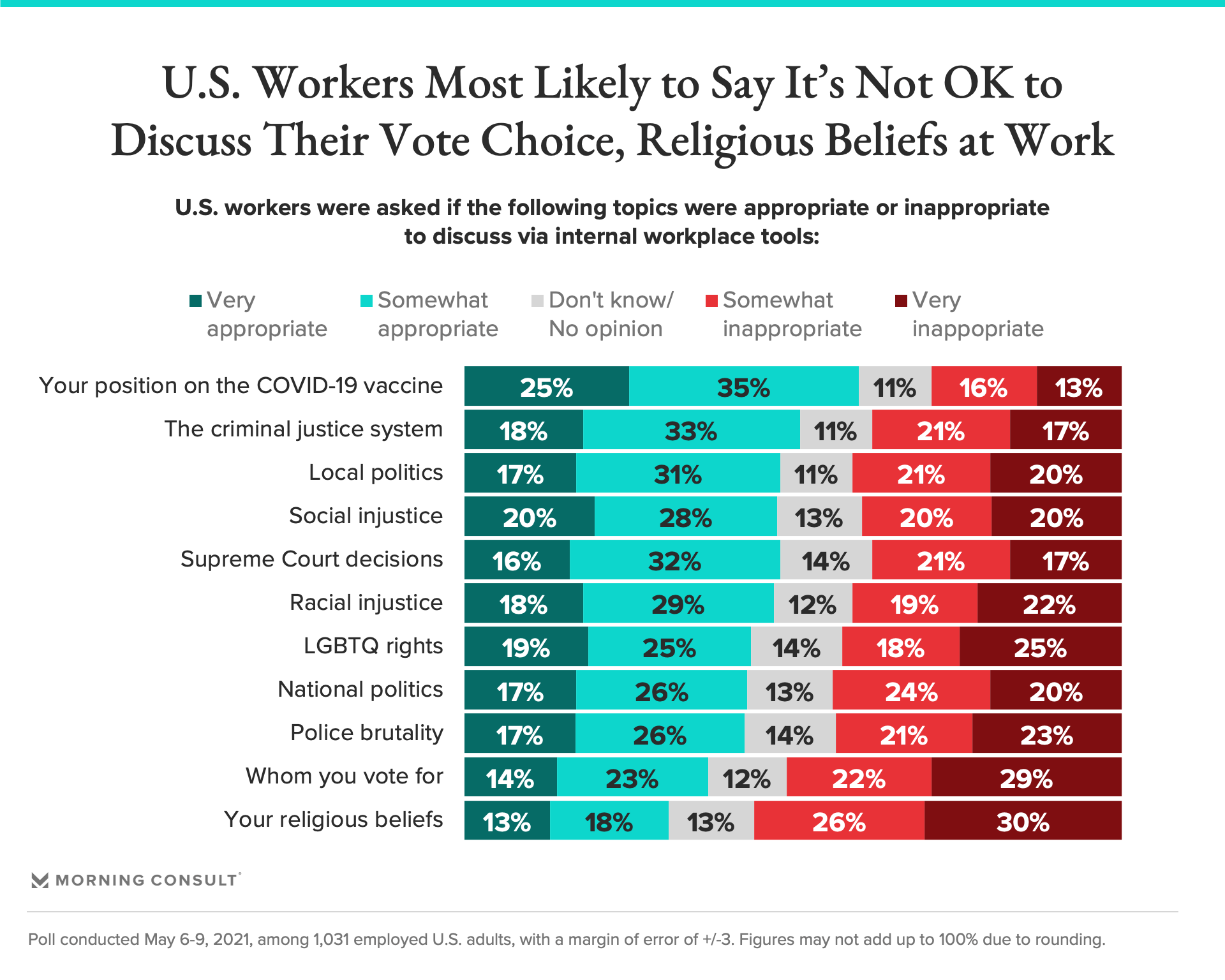 While more than half of workers polled view discussing religious beliefs or whom they voted for in an election as inappropriate workplace topics, a similar share believes it’s fine to discuss the criminal justice system, and even more (60 percent) said it’s appropriate to talk about the choice to get vaccinated against COVID-19, according to the survey, which polled 1,031 U.S. workers and carries a margin of error of 3 points.