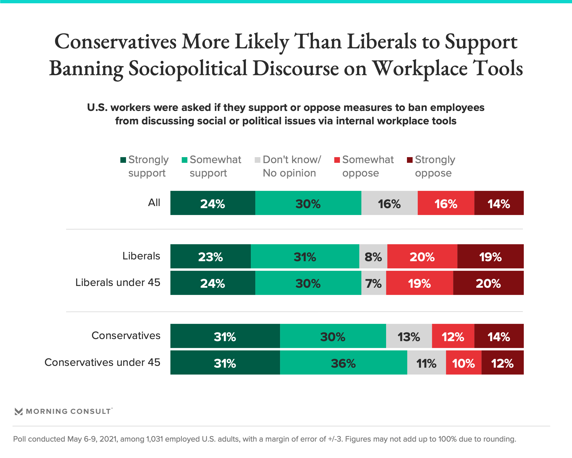 More than half of employed Americans (54 percent) said they supported measures to ban workers from discussing social or political issues via internal workplace tools, compared to 30 percent who opposed them.