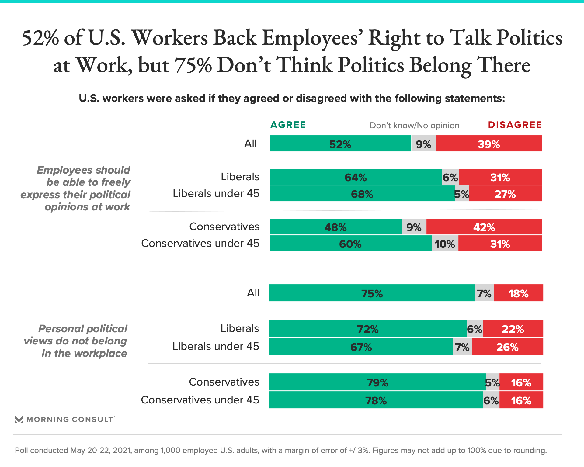According to a new Morning Consult survey conducted May 20-22, 52 percent of U.S. workers said they agreed that “employees should be allowed to freely express their political opinions at work,” compared with 75 percent who also said that “personal political views do not belong in the workplace.” The poll was conducted among 1,000 U.S. adults who said they worked in the private or public sector, with a margin of error of 3 percentage points.