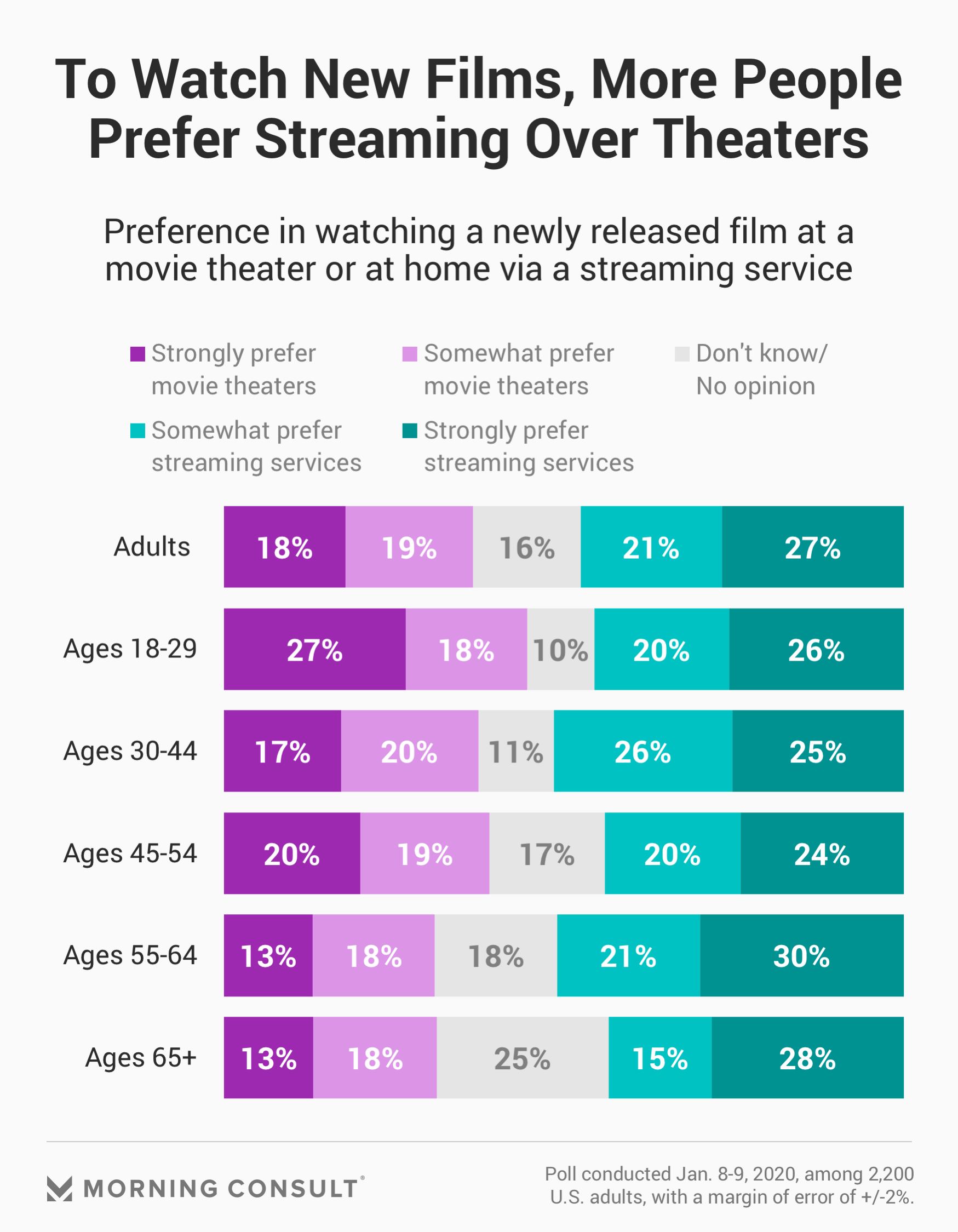 A Jan. 8-9 Morning Consult/The Hollywood Reporter survey of 2,200 U.S. adults found that a 48 percent plurality of adults strongly or somewhat preferred to watch recently released films via streaming services, compared to 37 percent who said they would rather see them on the silver screen. However, those ages 18-29 were evenly split on where they preferred to watch new films: Forty-five percent said they preferred going to movie theaters, while 46 percent said they liked to stay home and watch on a streaming service.