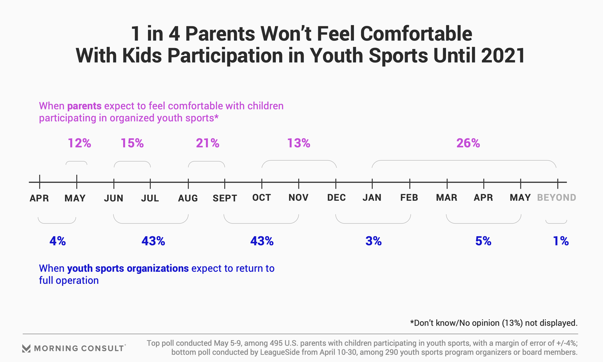 Most youth sports organizers indicated they expect to have kids back on the field no later than November. Forty-three percent of programs said they expect to return between June and August, with a nearly identical share eyeing September through November. Roughly 1 in 10 organizers said they don’t realistically expect to be up and running again until 2021.