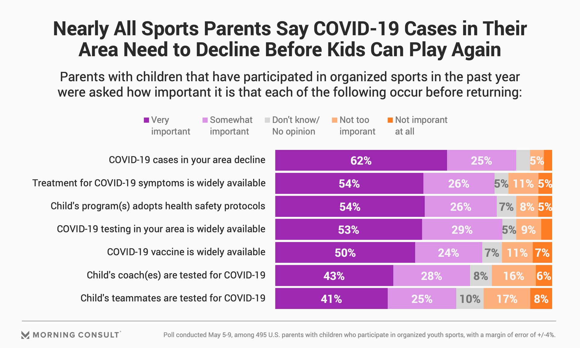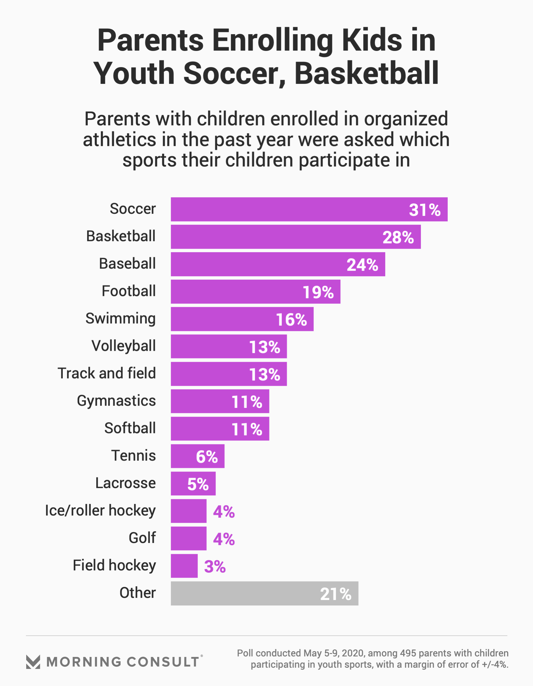 The Morning Consult poll of 2,200 U.S. adults, conducted from May 5-9, has a margin of error of 2 percentage points. The group of 495 parents whose children participate in youth sports has a 4-point margin of error.