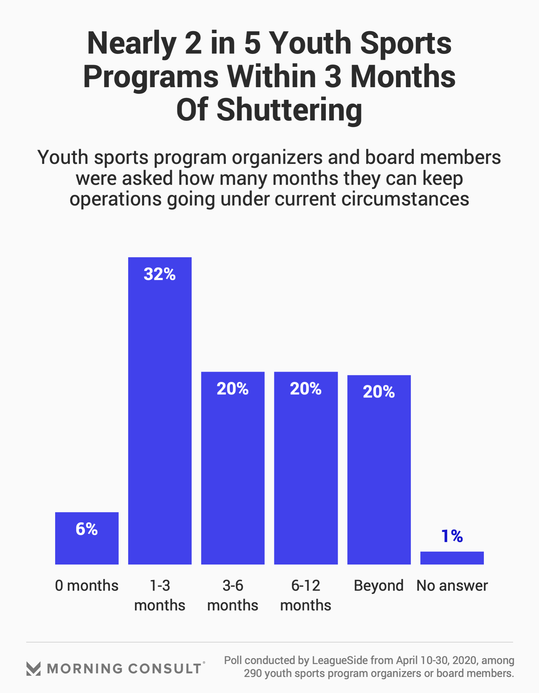 In a survey of 290 youth sports organizers from across the U.S. provided exclusively to Morning Consult by youth sports sponsorship platform LeagueSide, 46 percent of programs said they are in danger of permanently shuttering due to the impact of COVID-19. In addition, 38 percent of organizations said they have, at most, three months of runway remaining before they go under given their current circumstances.