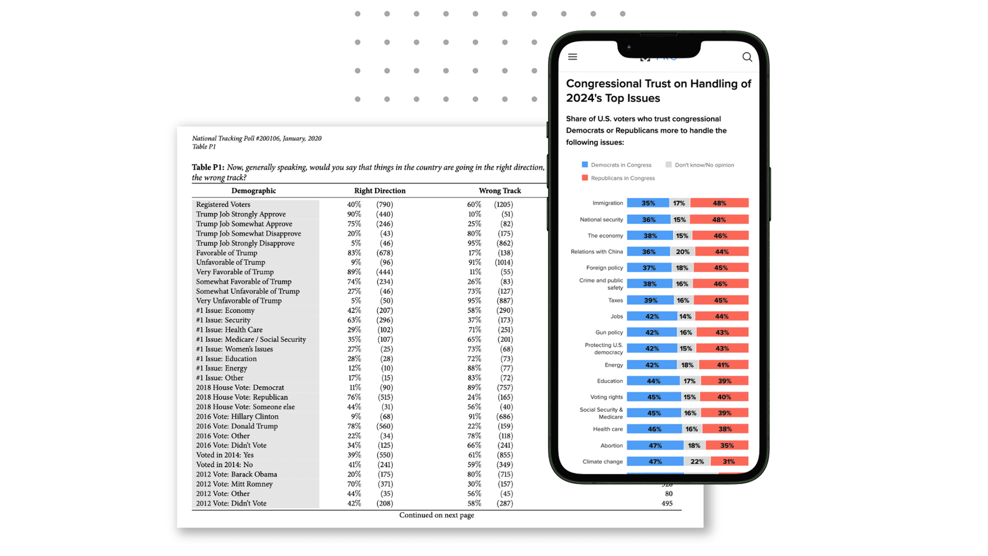 Access to trended U.S. political data covering: Elections (vote choice and drivers, congressional trust, policy attitudes, & more), Senator & Governor Ratings, Presidential Approval, Foreign Policy, and more.