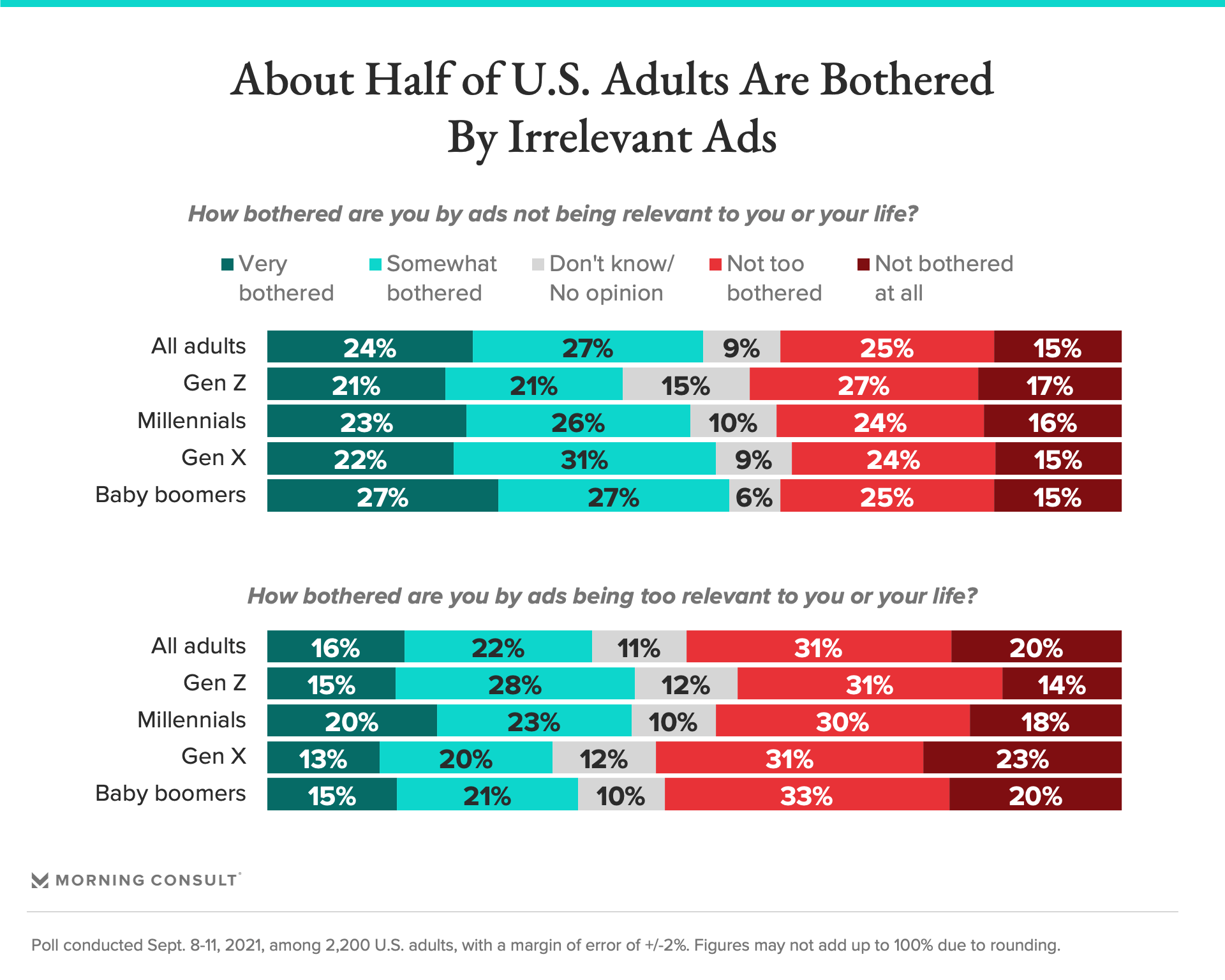 Viewers are also bothered by ads that lack relevance to them. Roughly half (51 percent) of Americans said they’re annoyed by irrelevant ads, a share that was consistent across generations.