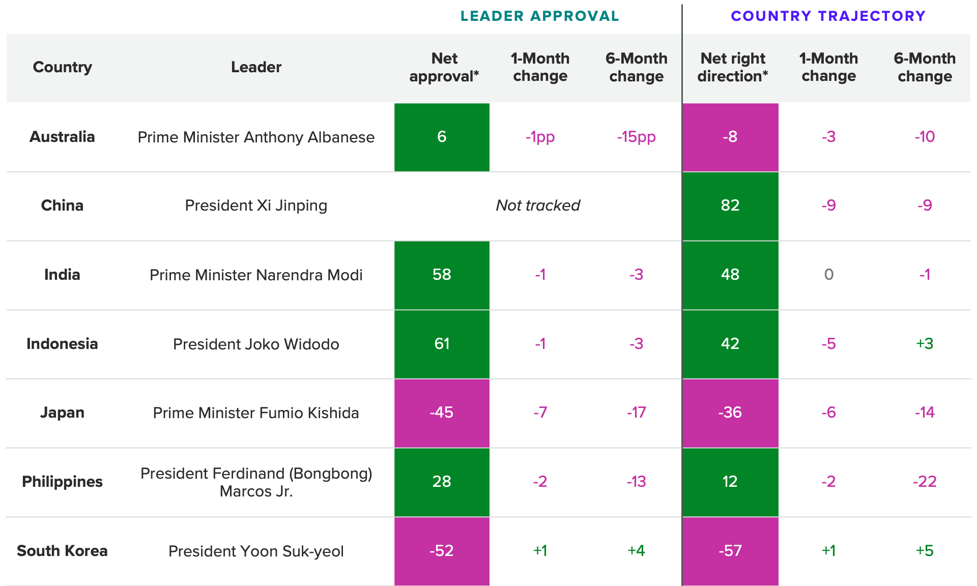 Morning Consult’s Leader Approval & Country Trajectory series track the net shares of adults in each country surveyed who approve of the incumbent political leader and say their country is headed in the right direction. For a downloadable version of the charts from this analysis, see the October 2023 APAC Leader Approval & Country Trajectory Chart Pack.