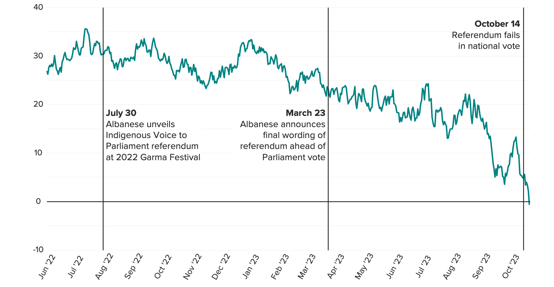 Prime Minister Anthony Albanese’s net approval rating is at an all-time low following the Oct. 14 failure of his signature campaign promise, known as the “Indigenous Voice to Parliament.” The measure, which would have constitutionally recognized Australia’s indigenous people for the first time by establishing a non-voting advisory committee of indigenous representatives, passed both houses of Parliament but was soundly rejected by Australian voters in a national referendum. Australia’s net country trajectory fell into negative territory for the first time during the closing stages of the bruising campaign, which left the country deeply divided.