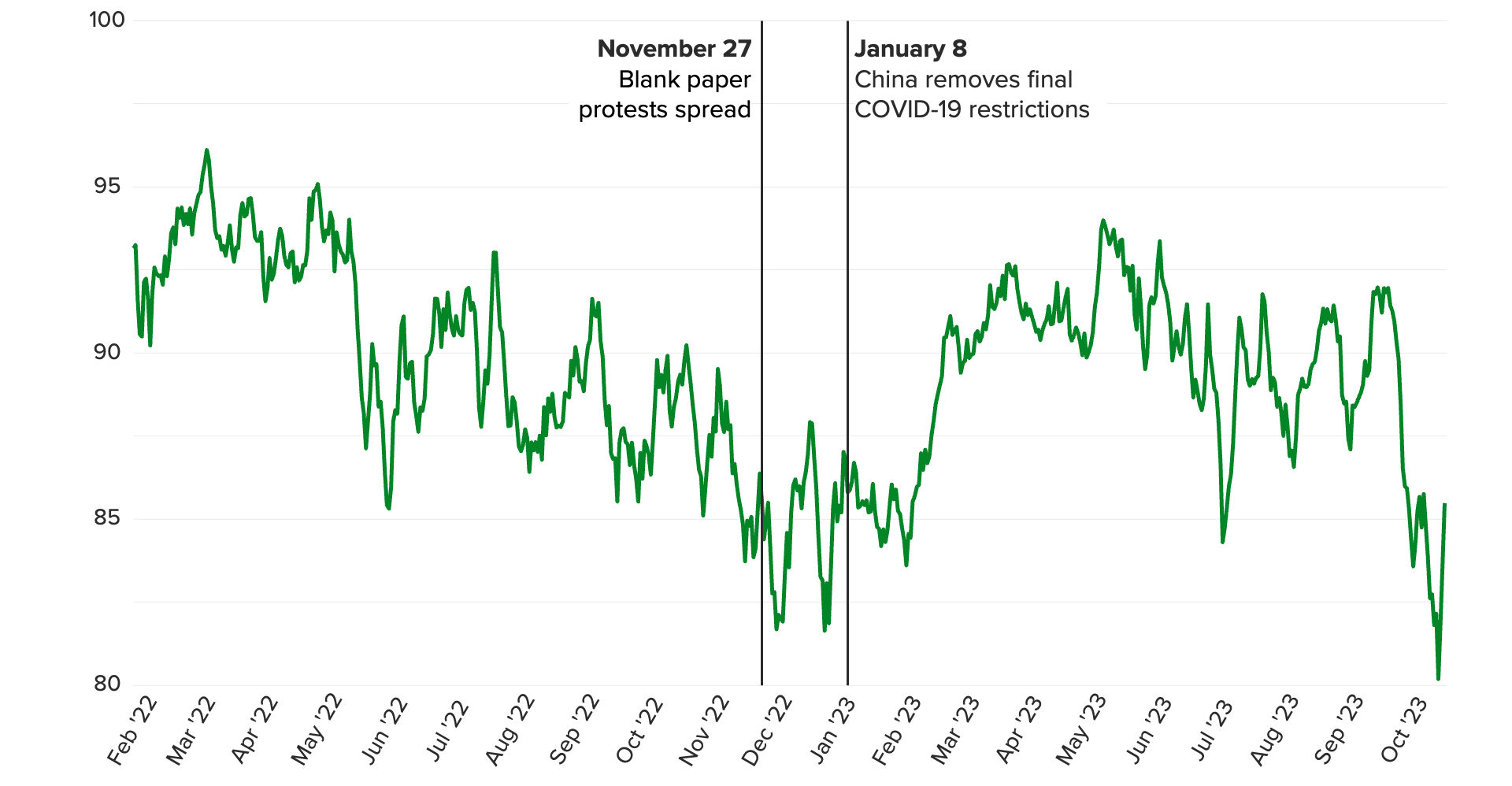 While growing dissatisfaction will be worrying for Chinese President Xi Jinping and the Communist Party, it is unlikely that this metric predicts a renewed wave of protests. Last year’s so-called “blank paper protests” — named for participants’ use of blank pages to signal their frustration over issues that remain verboten in China’s heavily censored and controlled civil society — were largely driven and organized by, if not limited to, young adults in major cities. During the height of the protest movement, net satisfaction among China’s youngest adults fell as low as 71%. Current levels of public dissatisfaction over the economy have been broader but less intense: Despite an employment crisis for young adults, dissatisfaction among Gen Z adults was sitting at 84% as of Oct. 15, slightly higher than that of adults overall. Both measures have flirted with the 80% mark since, however. We advise watching this metric as a signal of whether public views of China’s overall trajectory are poised for a rebound or further erosion. Xi’s firm grasp on Chinese political life, meanwhile, makes any sort of internal challenge to his rule unlikely, though further erosion of public support could hamper his long-term vision for fundamentally reordering China’s social and political priorities.